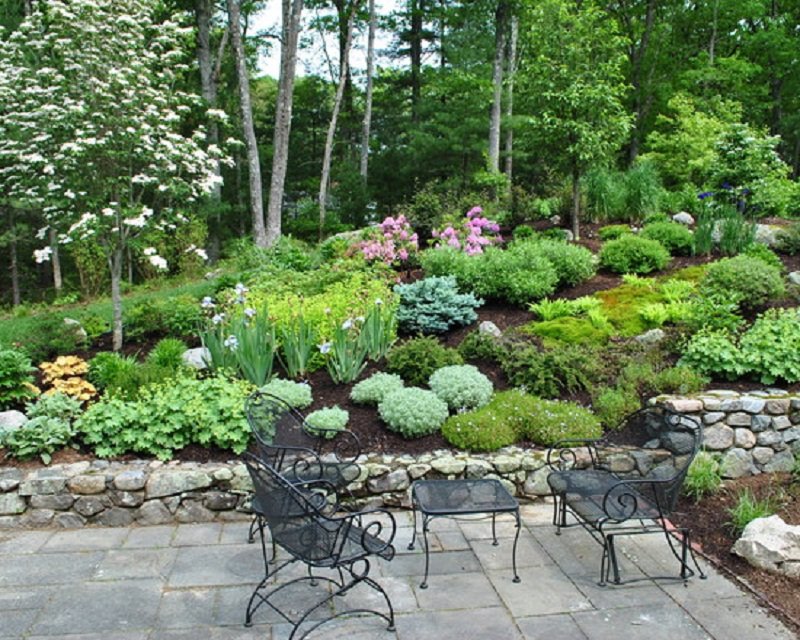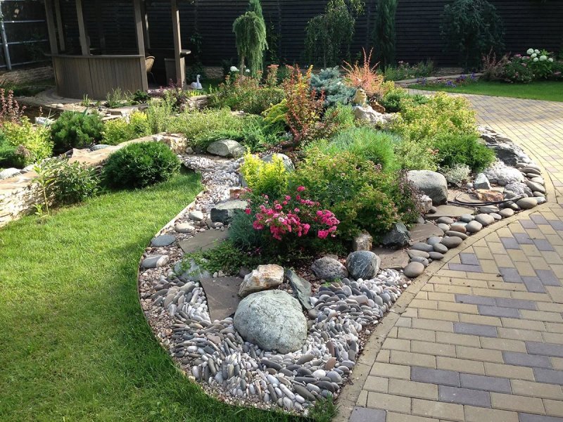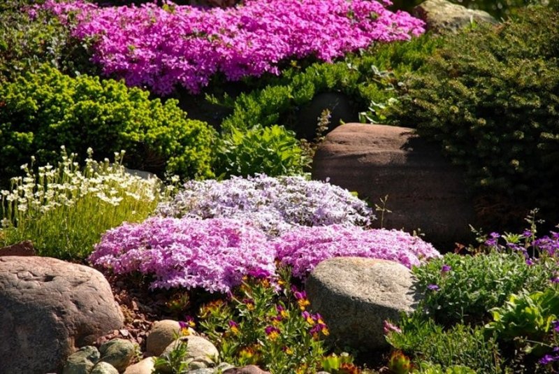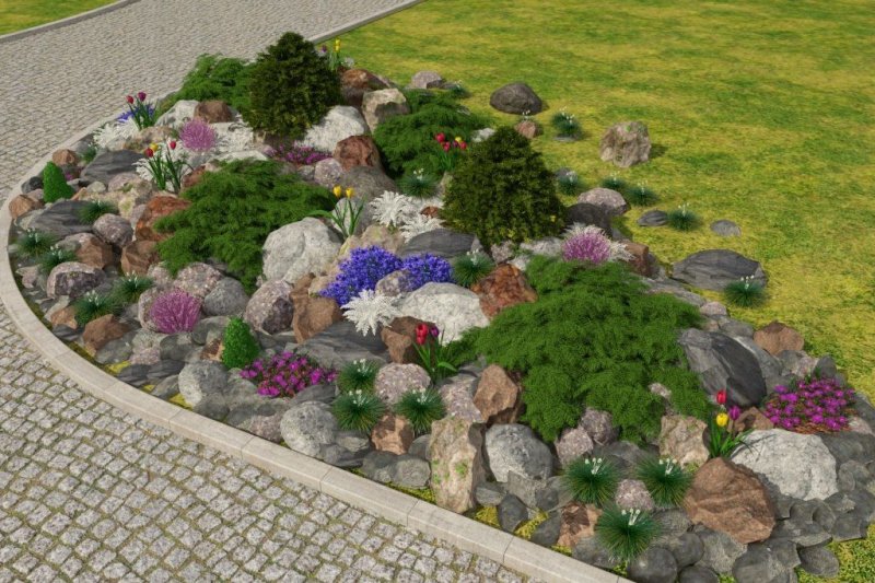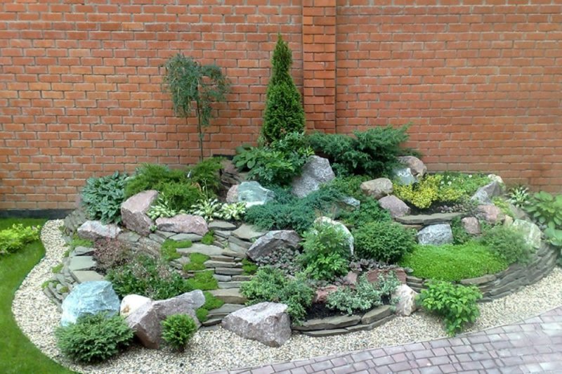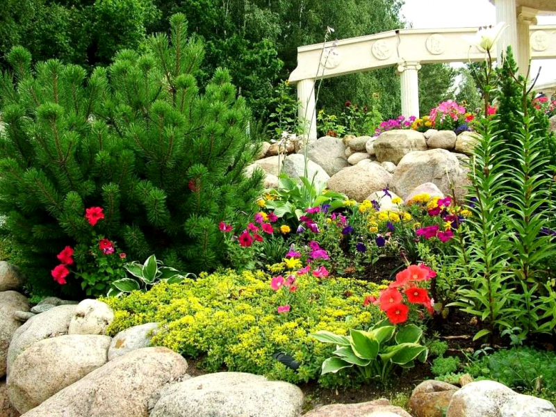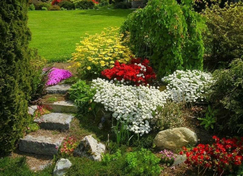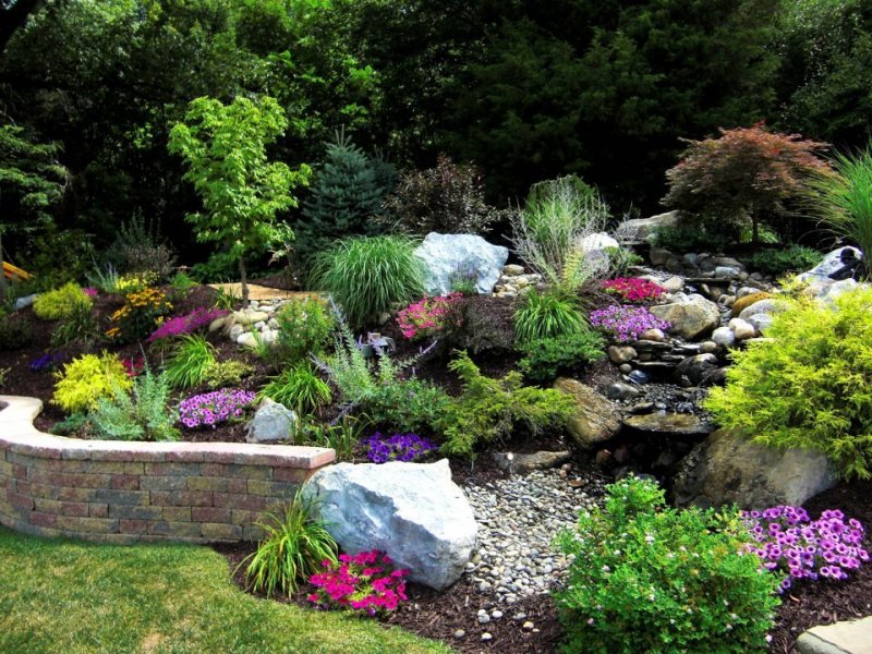 | 7 | Альпийский сад | Садик разбивают на наклонной или плоской поверхности, используют минимум камней | Акцент делается на кустарниках, ярких растениях |