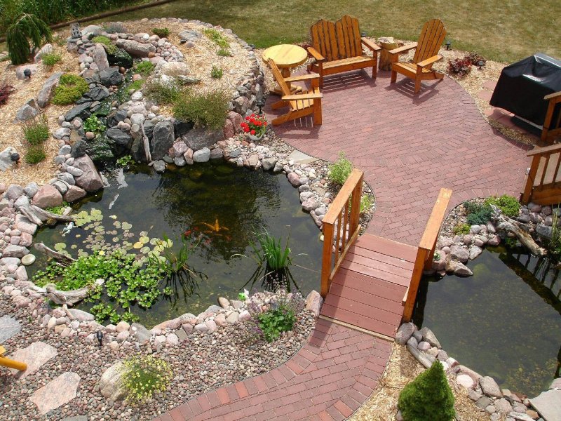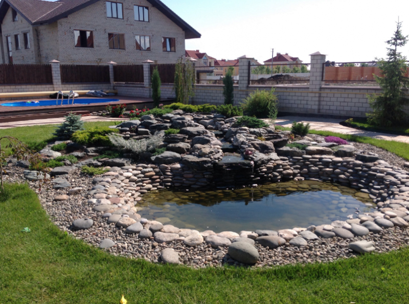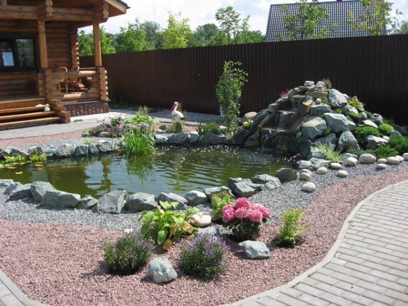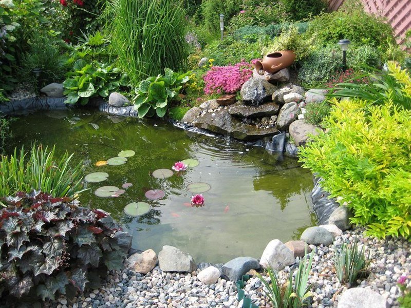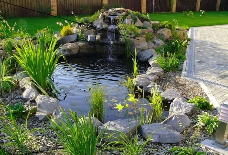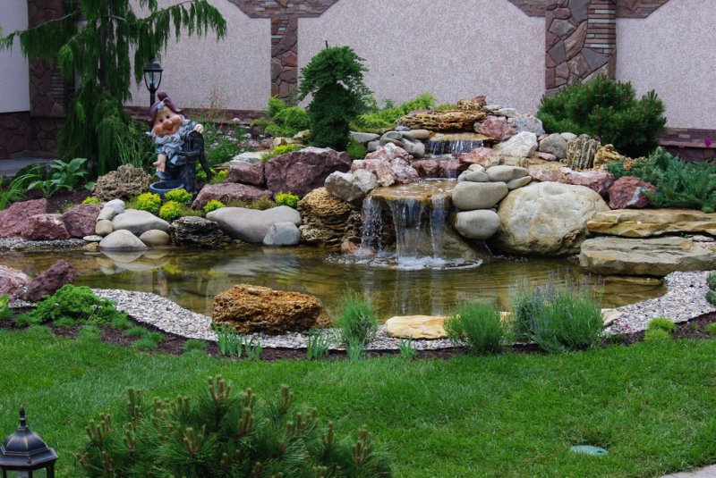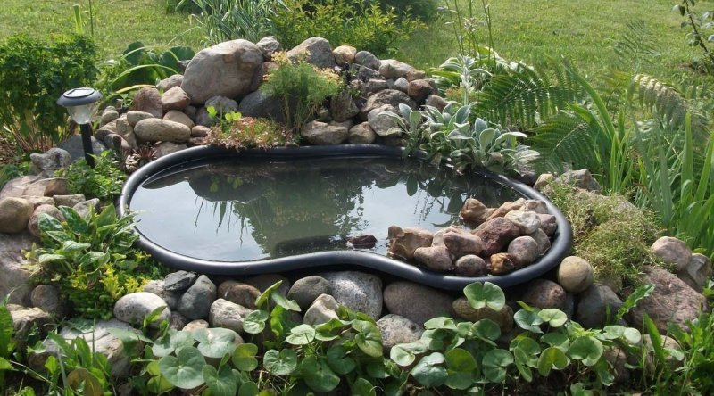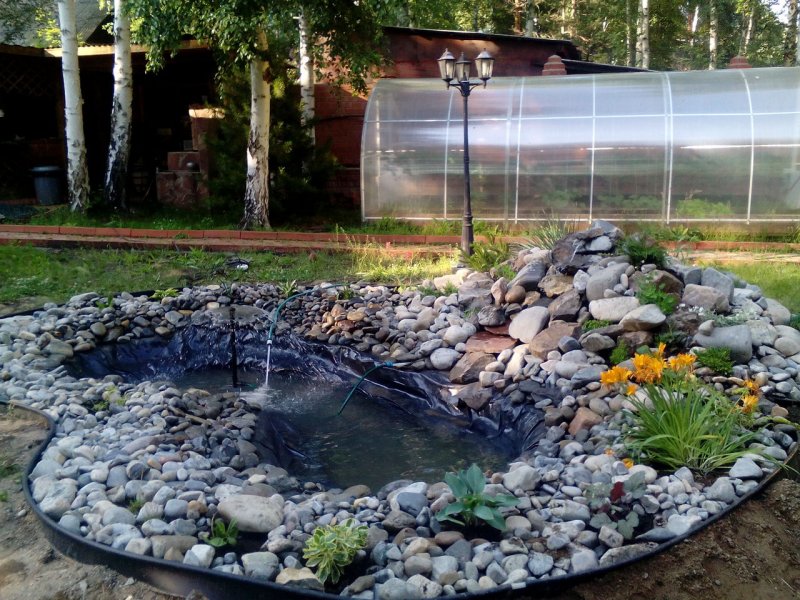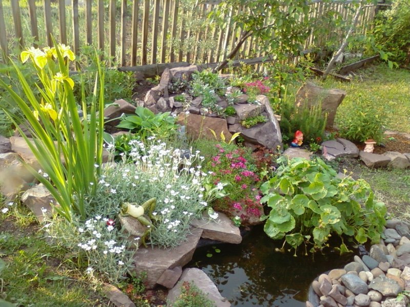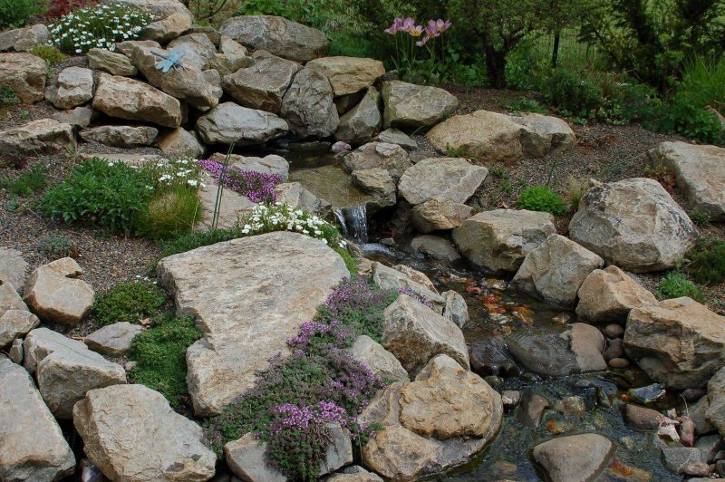 Для пруда вырывают котлован, изолируют стенки бутилкаучуковой пленкой. Маленький водоем можно сделать из автомобильной покрышки или специального стеклопластикового вкладыша, которые укладывают в повторяющую форму бортиков яму. Для струящегося по каменному руслу ручья в пруд монтируют насос, подсоединяют к шлангу подачи воды. Для каскада берут плоские камни, скрепляют монтажной пеной, швы прикрывают мелкими обломками. Украсит альпинарий, создаст прохладу небольшой фонтан. Чтобы облегчить работу, покупают насос со встроенным фильтром. Агрегат устанавливают в емкость, заливают водой, включают согласно инструкции. Для создания фонтана без насоса водопроводную трубу выводят в пруд. Воду можно отводить в сад для полива.