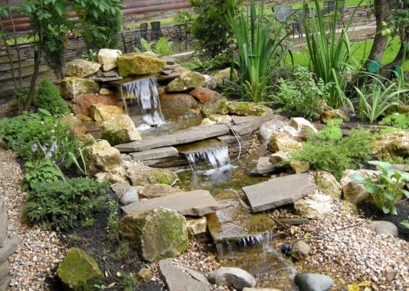 | 6 | Горный ручей | Дно ручья устилают речными камнями, по берегам укладывают окатыши, высаживают влаголюбивые растения | Создают эффект дикой природы рассаженные возле ручья папоротники с широкими перьевыми листьями |