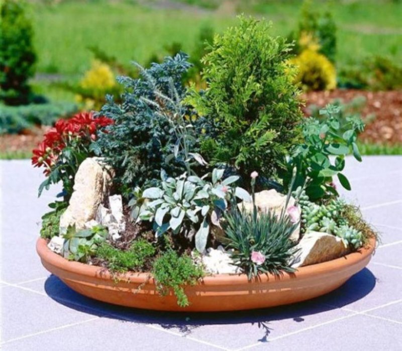 | 9 | Мини-альпинарий | Вырубку в большом стволе, керамическую емкость, таз заполняют землей, мелкими камешками, высаживают седумы, крупки, армерию | Предварительно делают сток для воды и дренаж |