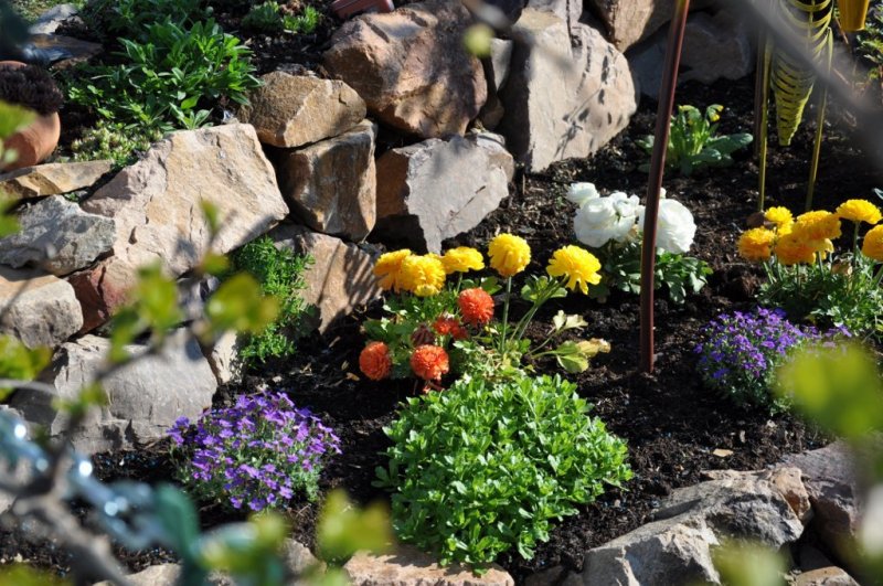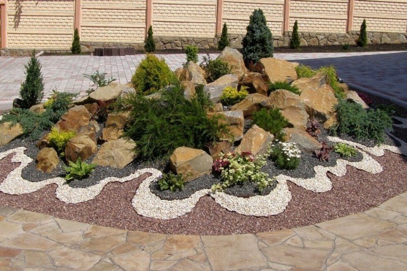 Альпийская горка – это земляная насыпь с уложенными ярусами камнями разнообразной формы, между которыми растут кустарники, низкорослые цветы. Искусственно созданный рельеф имитирует элементы, присущие горной местности – плато, склоны, утесы. Чтобы воспроизвести копию альпийского ландшафта, каменную клумбу засаживают горными растениями. Такой ботанический экстрим не приспособлен к местным условиям, поэтому часто заменяется местными тюльпанами, крокусами, брусникой, барвинком. Рокарий отличается от альпинария плоской поверхностью, большим количеством камней. Каменисто-гравийная площадка оформляется на ровной местности, может располагаться на площади в несколько десятков метров. Внешне рокарий приближен к ландшафту средней полосы, засаживается степной и лесной растительностью.