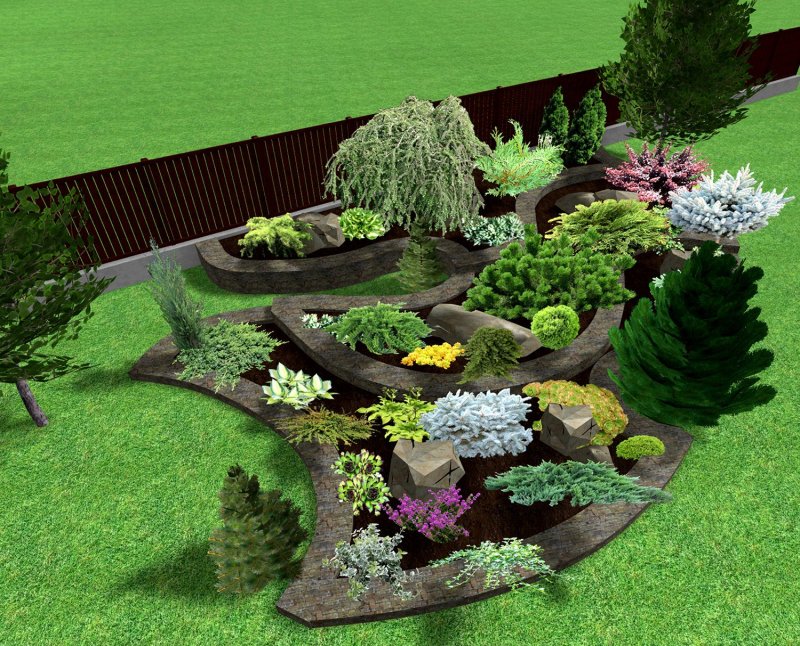 | 3 | Нижний | Подножие оформляют тенелюбивыми и влаголюбивыми культурами | Рододендроны, хвойники, камнеломки |