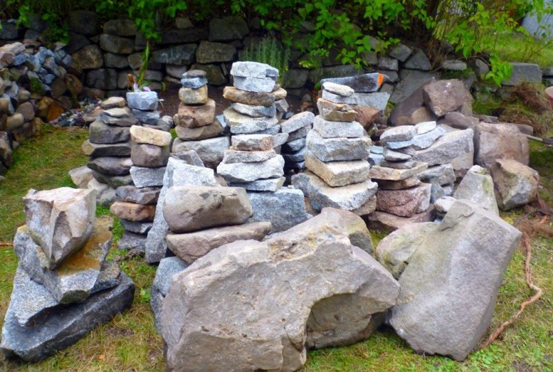 Вариант укладки зависит от вида альпийской горки. Для воссоздания долины глыбы укладывают хаотично. Для каменистой стенки выбирают одинаковые по высоте плоские обломки, неровности компенсируют мелкими камешками. При укладке горки на склоне камни располагают параллельно с небольшим уклоном назад.