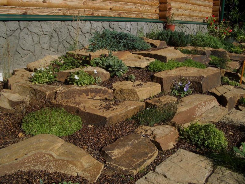 | 2 | Каменистая горка | У основания насыпи укладывают мелкие камни, вершину создают из крупных обломков, рассаживают высокогорные растения | Горка из валунов, слоистых камней сочетается с мощеными дорожками, газонами |
