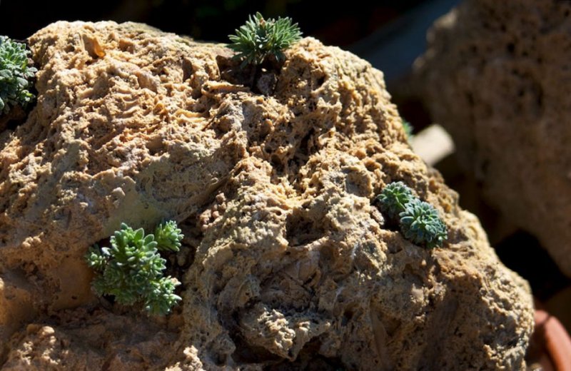 | 5 | Скальный утес | Воссоздают изломы горной местности с помощью каменных обломков, утес засаживают толстянками, стелющимися растениями | Работу начинают с основания склона, валуны плотно подгоняют |