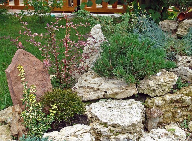 | 8 | Японские мотивы | Создают видимость обрушившейся скалы, живописную зону оформляют базальтом, туфом, участок у основания декорируют перлитом, мелким гравием | Подчеркивают стиль растения серого, желто-коричневого оттенка, приглушенного красного цвета, карликовые кустарники асимметричной формы |