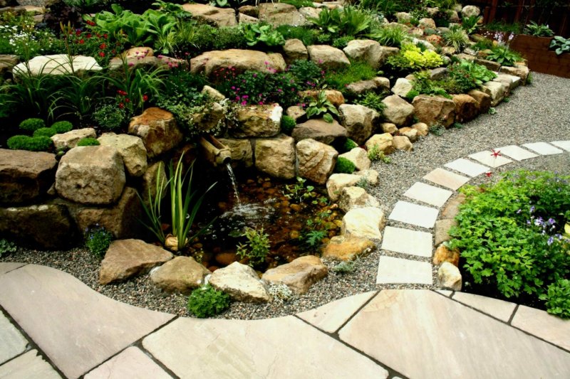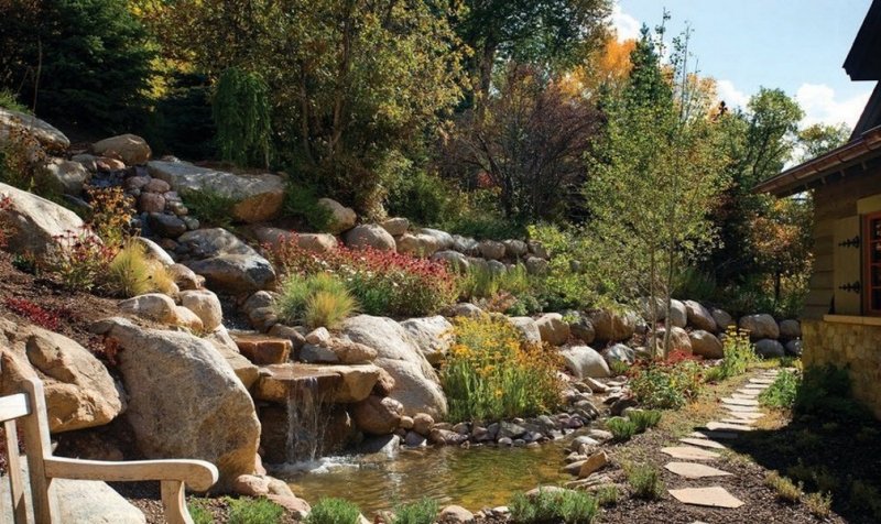| 4 | Горная долина | Камни закапывают в землю на три четверти, прокладывают тропинки, создают травяной ковер, высаживают кустарники | Обилие трав и цветов можно дополнить фонтаном или небольшим прудом |