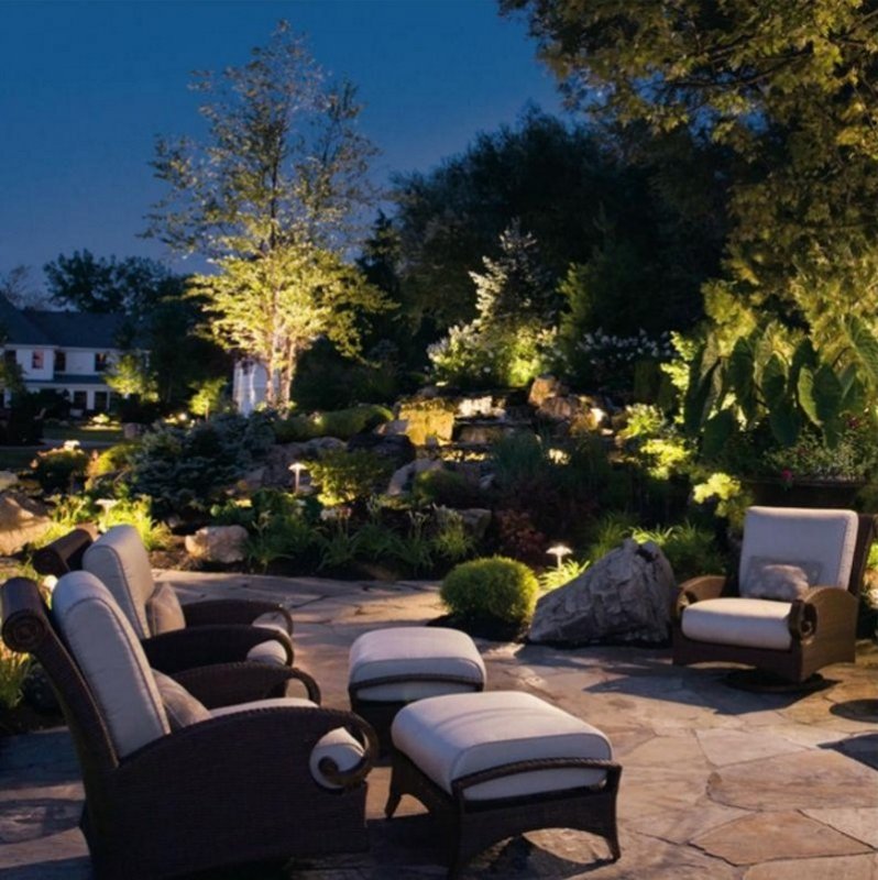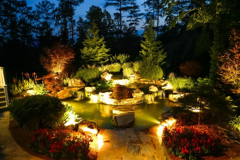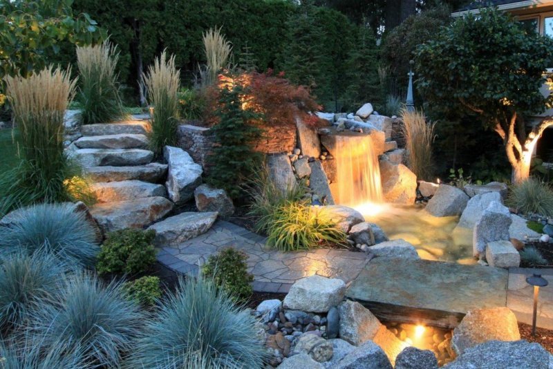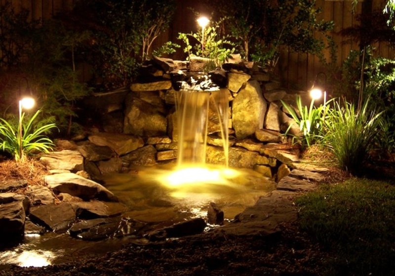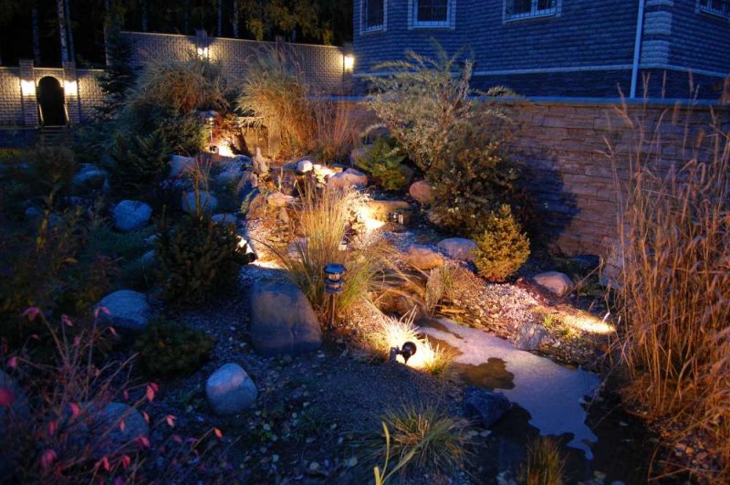 Эффектно смотрится вечером альпинарий, подсвеченный мини-прожекторами или led-светильниками на колышках. Лампами с широким углом рассеивания освещают кустарники, светильники направленного света подсвечивают цветы, листву. Самый простой вариант подсветки – фонари на солнечных батареях. Отсутствие кабеля дает свободу действия, осветительные приборы можно устанавливать на каждом ярусе, подсвечивать водоем, террасы. Грунтовыми светильниками можно очертить контур живописной зоны или выделить кустарники. Подводная подсветка лампами разных цветов визуально увеличивает объем, раскрашивает воду. Свободно передвигаются по пруду плавающие светильники-шары на солнечных батареях.