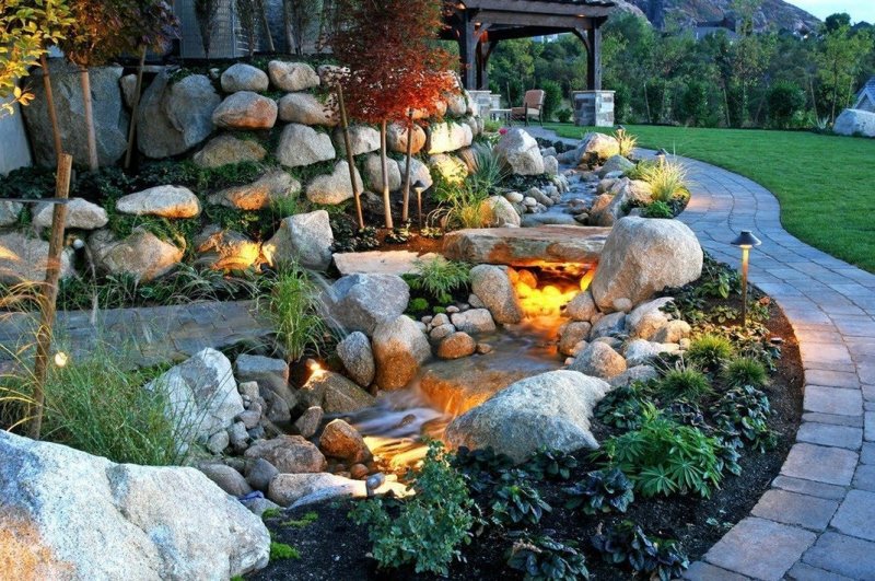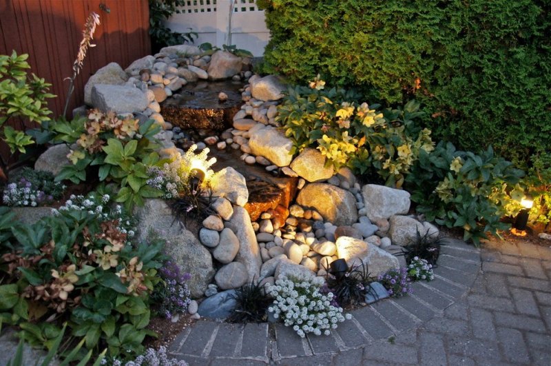 Декор из природных материалов, искусственные водоемы, подсветка, придают альпинарию уникальность. Горный пейзаж дополнят сухие ручьи. При правильном обустройстве кажется, что по высохшему руслу недавно струился водный поток. Исток ручейка должен выходить из-под большой глыбы, устье скрывают в зеленых насаждениях, крупных листьях. Водную поверхность имитируют галькой, мелким гравием.