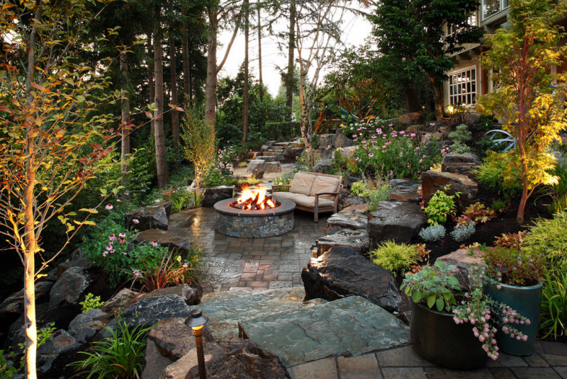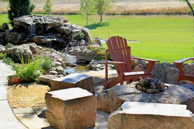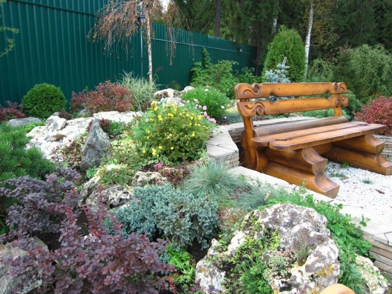 За фрагментом горной природы выделяют лужайку для отдыха. Для уюта две стороны обрамляют зеленой стеной из листопадных кустарников, низкорослых сортов кипарисовика и туи, которые достигают 80-90 см. С альпинарием сочетается площадка с плавными контурами, усыпанная гравием или вымощенная таким же материалом, как дорожки. Зону отдыха обустраивают садовой мебелью из ротанга. Для стола на основание из глыб укладывают слэб (крупноразмерная плита) из скальных пород. Оригинальные столики и скамейки делают из габионов и досок. Такие варианты создают ощущение гармонии и цельности. Для чтения у пруда можно на камни уложить поддон. Согреет, украсит участок каменный уличный очаг.