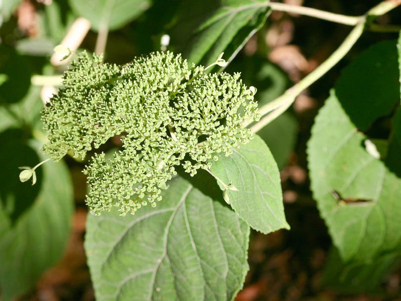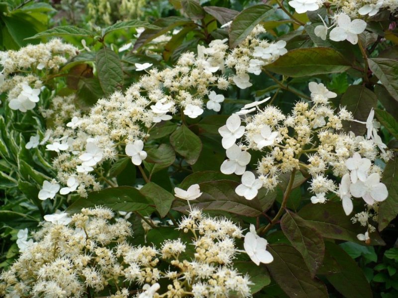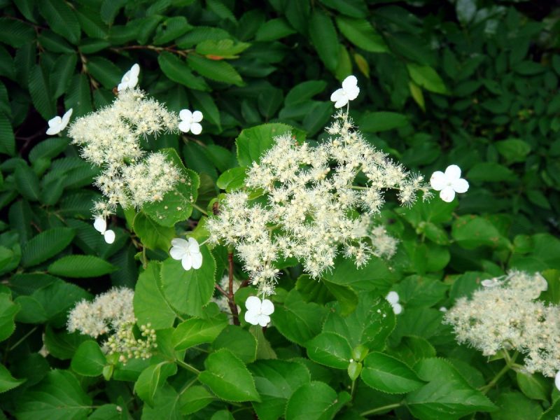 Гортензия черешковая или лазящая — уникальный плетущийся вид, который не имеет ствола. Если сравнивать растение с другими представителями рода, то цветок крайне неприхотлив. Все, что ему требуется, так это обильный полив и свободное пространство для буйного роста. Имеет широкие листья и белые соцветия, собранные в пышные щеточки. Гортензия черешковая морозостойка, но молодые побеги первые пару лет лучше укрывать на зиму.