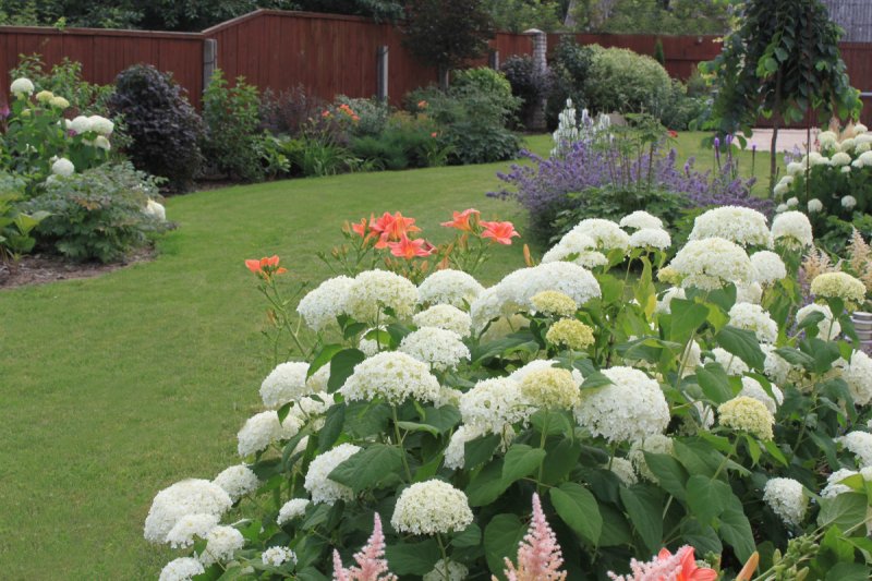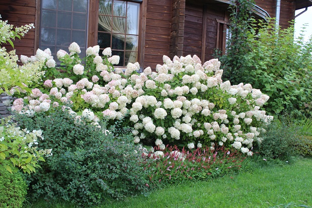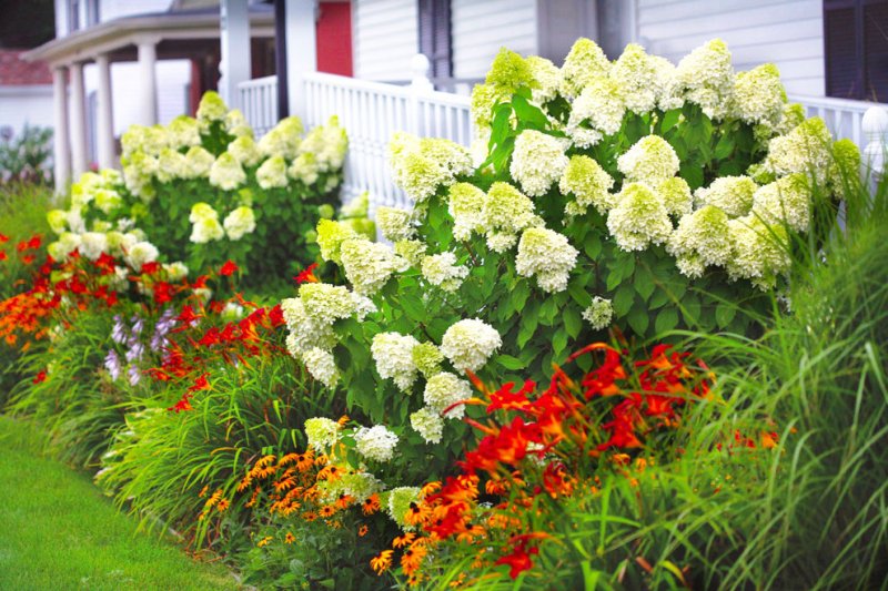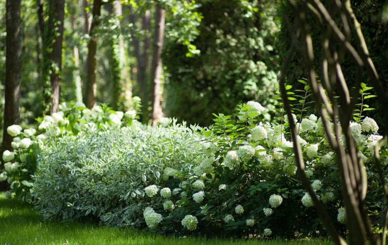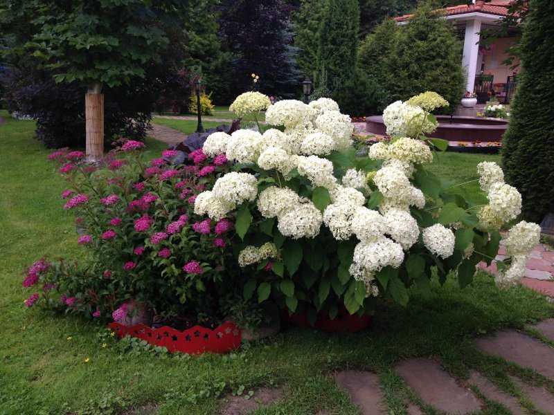 Гортензии отлично сочетаются с кустами сирени. Крупные соцветия растений гармонируют друг с другом, подчеркивая пышность и даже легкую торжественность оформления. Мелкие цветки спиреи и чубушника — еще один вариант дополнения для щеточек гортензии. Так как все виды относятся к влаголюбивым, кусты можно высадить неподалеку от водоема. В этой зоне их комбинируют с зарослями бадана и астильбы. Еще один вариант групповой посадки — комбинирование с другими кустарниками в составе живой изгороди (самшит, кизильник, можжевельник). Можно поэкспериментировать и рассадить гортензию рядом с цветами «королевских кровей»: лилиями или розами. Для плетущегося вида в качестве соседа подойдет клематис или плющ.