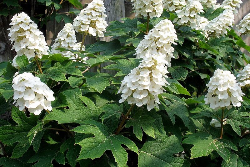 Гортензия дуболистная, как и пепельная, родом из южных областей Северной Америки. Вид относится к незимостойким, поэтому в наших широтах в открытом грунте не выращивается, но идеально подойдет для закрытой оранжереи. Имеет роскошные пирамидальные «гроздья» соцветий и крупные листья с зубчатыми лопастями, похожими на виноградные. К осени листва становится багряно-пурпурной.