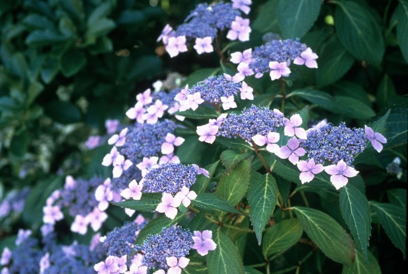 Гортензия пильчатая — пышный кустарник, достигающий в высоту до 1,5 м. Листья небольшие, веретенообразные с острым кончиком. В начале цветения имеют насыщенный, густой зеленый оттенок. Соцветия собраны в рыхлые щеточки. Может менять окрас в зависимости от кислотности почвы. В слабокислом грунте плодущие цветки сердцевины имеют глубокий синий оттенок, а бесплодные по краям — голубой с белой каймой. Также встречается красивый сиреневый окрас. Перед отцветанием стерильные цветки по краям щеточки розовеют. Период цветения длится с июля до сентября. Если климат растению не подходит или оно не получило должного ухода, то этот период сокращается до августа. Самым популярным сортом пильчатой гортензии считается Blue Bird. Соцветия «Голубой Птицы» имеют необычный сине-фиолетово-пурпурный окрас. Как и большинство представителей рода, пильчатая гортензия отдает предпочтение слабокислым почвам, местам с рассеянным светом и обильному поливу.