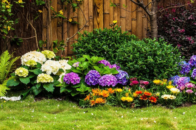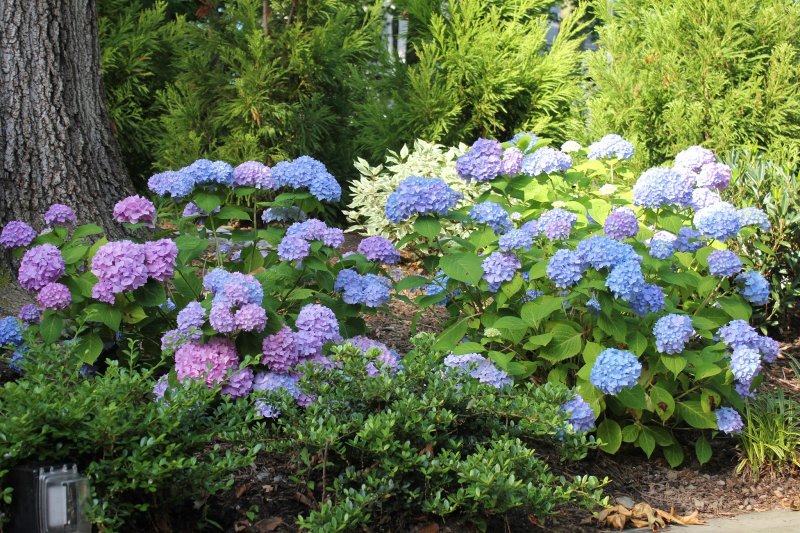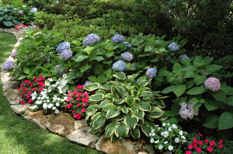 Низкие, аккуратно подстриженные кустарники гортензии подходят для опрятных клумб возле дома и вдоль дорожек. Высокие насаждения станут центром свободной композиции, рабатки, миксбордера или ленты живого ограждения. Так как гортензия — многолетник, клумбу непрерывного цветения нужно оградить низкорослыми хвойными растениями, которые оттенят красочность «сердцевины» композиции. Место для цветника зачищают от сорной травы, перекапывают и удобряют. Комбинировать компоненты композиции нужно по оттенкам и высоте. Если клумба прилегает к забору или другой преграде, то есть является односторонней, то сначала высаживают высокие растения, постепенно переходя к тем, что пониже. Если цветник располагается по центру (к примеру, между садовыми дорожками), то высокие цветы располагают в центре.