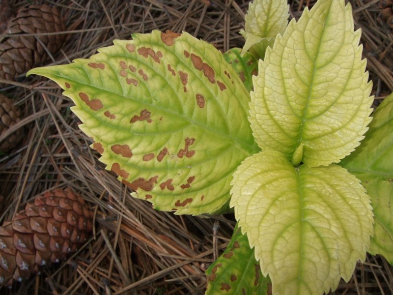 Реже гортензию поражает септориоз. Первый признак болезни — появление черных пятен на листьях. В запущенной форме они поражают и веточки. Если вовремя не остановить развитие болезни, то растение, лишившееся листвы, погибнет. Лечат септориоз препаратами, содержащими в составе медь. Мучнистая роса тоже проявляется в пятнах на листве, но светло-серого цвета. Если куст будет поражен этим заболеванием, то не сможет пережить зиму. Лечат мучнистую росу специальными фунгицидами.