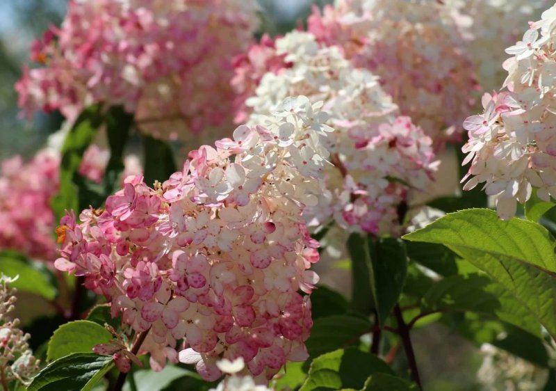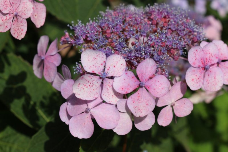 Гортензия крупнолистная или садовая — кустарник, который может достигать в высоту до 4 м. Имеет широкие листья с острыми кончиками, щедро покрывающими веточки. Розовые цветки собраны в соцветия-метелочки. В культурных сортах еще встречается голубой и белый окрас. В отличие от других видов рода Гортензия, это растение любит солнце и его можно высаживать в местах со слабой полутенью. Именно этот вид, несмотря на «садовое» название, активно высаживается в горшочки и водружается на подоконники. Предпочитает средне- и слабокислые почвы. В зависимости от их кислотности может менять окрас соцветий. Для поддержания растения, которое было высажено в щелочную почву, специалисты рекомендуют поливать его раствором с содержанием солей. Обладает низкой устойчивостью к морозам, из-за чего в открытом грунте растет только на юге России. В остальных регионах ее выращивают в закрытых оранжереях и зимних садах. Повысить морозостойкость растения можно только с помощью правильного ухода и обильного полива в летнее время. Соцветия будут образовываться на прошлогодних побегах, поэтому сохранить их — главная задача садовода. Если все же рискнуть и посадить гортензию в открытый грунт в средней полосе, то на зиму куст придется надежно укрывать. Можно использовать такие же материалы, как и для нежных садовых роз. Растет быстро, хорошо размножается черенкованием.