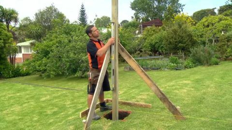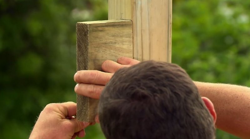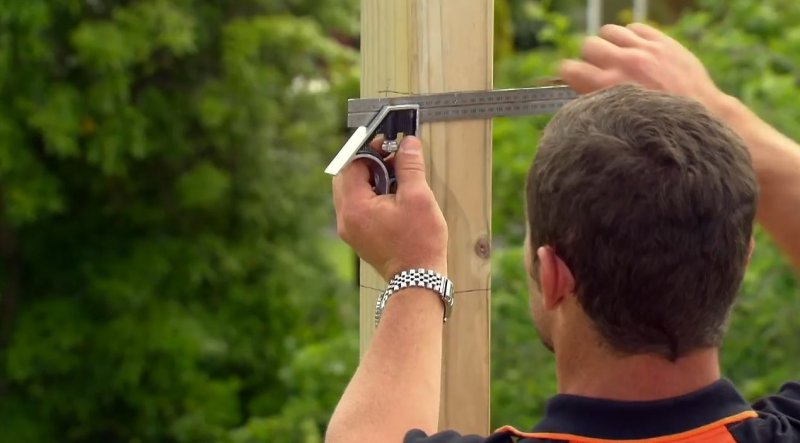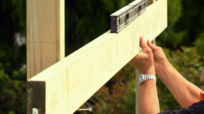 К нижней обвязке монтируют вертикальные стойки. Для них предусмотрены места по углам, с двух сторон от входа и по центру. Также их можно закопать прямо в грунт и забетонировать. В верхней части они имеют такую же обвязку, как и в нижней. Монтируют брус строго по уровню с использованием шаблона диагонали. При выборе размера стоек необходимо учитывать высоту беседки. Малейшие отклонения негативно повлияют на прочность конструкции и ее внешний вид.