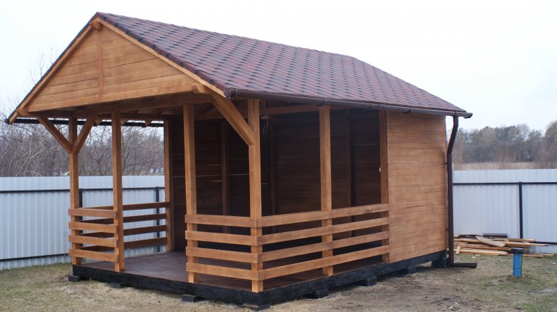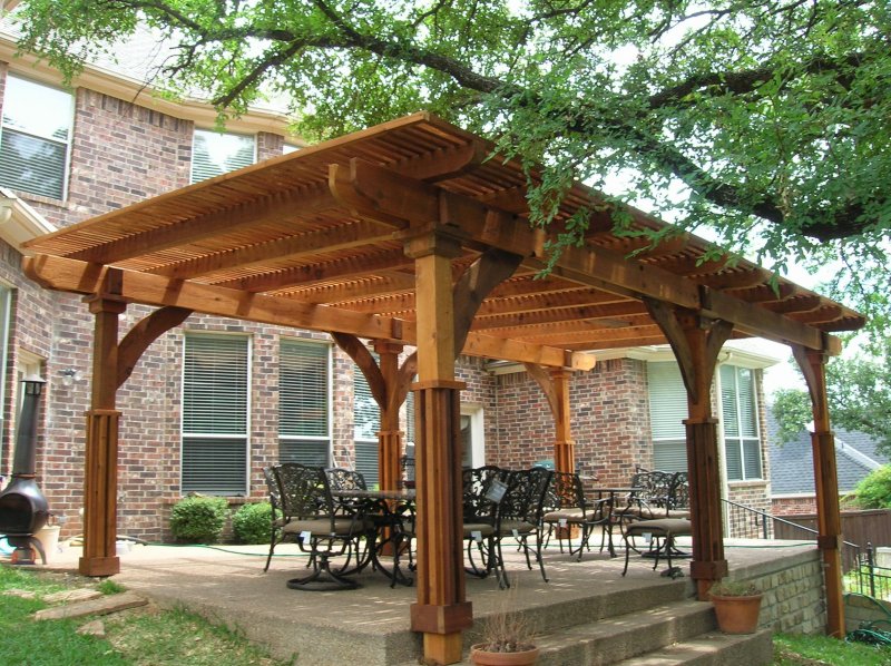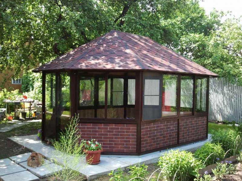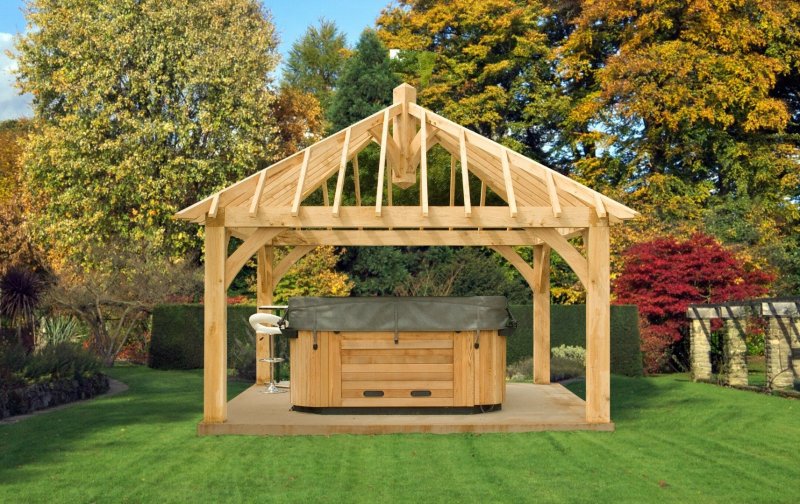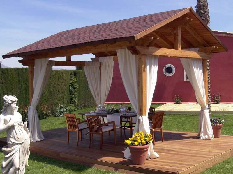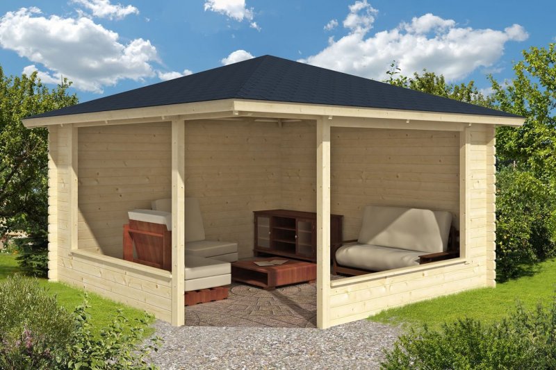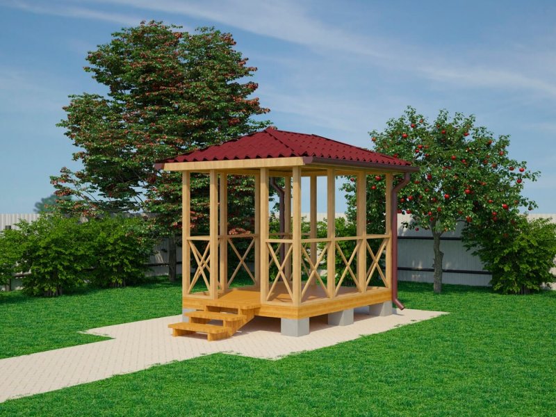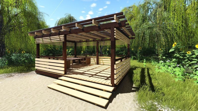 Открытые. Представляют собой каркас с кровлей. Постройка используется только в теплый период. Для защиты от насекомых, ветра, дождя могут быть установлены шторы.