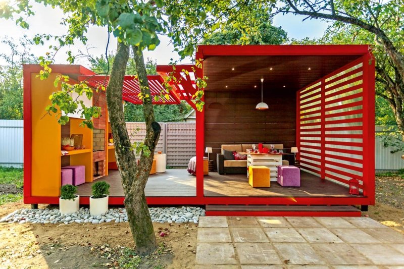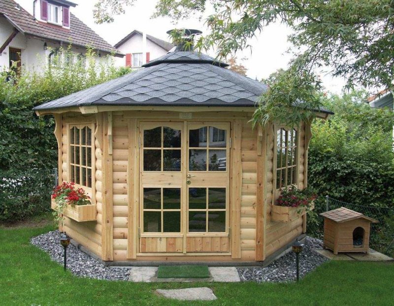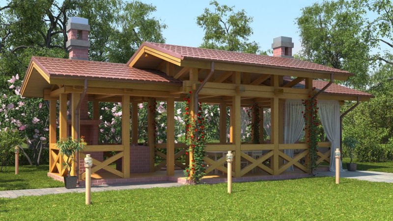 Многофункциональные, комбинированные. В них совмещается зона отдыха с местом для приготовления пищи. Постройка оснащена мангалом или печью.
