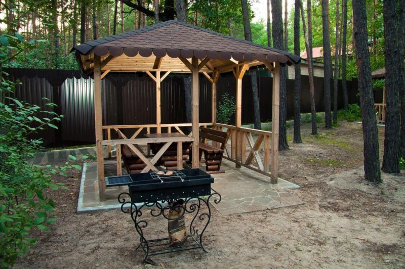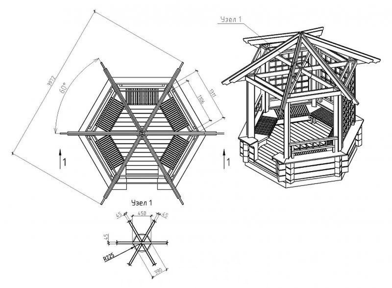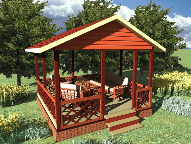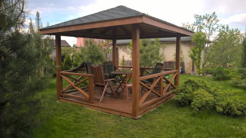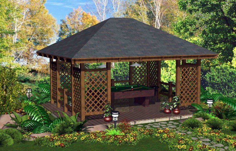 Легкое архитектурное сооружение, возведенное в собственном саду или на даче, украсит территорию возле дома, придаст участку завершенный вид, оформленный по всем правилам ландшафтного дизайна. У каждого человека садовый павильон ассоциируется с разными ощущениями и воспоминаниями. Именно беседки из дерева позволяют отдохнуть на свежем воздухе, укрыться от солнечных лучей, насладиться природой и едва заметным ветерком. Еще несколько столетий назад в этих постройках вельможи принимали гостей, украшая стены богатым убранством, подчеркивающим их статус. Сейчас, когда ускорился ритм жизни, ценность строения остается достаточно весомой. Здесь можно совместить чаепитие с увлекательным чтением, провести романтический вечер, вздремнуть в успокаивающей атмосфере под пение птиц, спрятаться от дождя. Содержание Особенности и назначения беседок Преимущества и недостатки деревянных беседок Виды и типы деревянных беседок Конструкции крыши для беседок Выбор древесины для строительства Стилистические направления Внутренний декор и оснащение беседки Необходимый уход Пошаговая инструкция Чертеж будущего строения Материалы и инструменты Обустройство фундамента Монтаж стоек Монтаж верхней обвязки и досок пола Средняя обвязка каркаса Обустройство крыши Декоративная отделка Заключение Особенности и назначения беседок В качестве основного материала можно использовать кирпич и металл. Но большинство отдают предпочтение только натуральной древесине. Среди особенностей этого сырья можно выделить его запах, который имеет своеобразное влияние на самого человека. Он насыщает энергией и радостью. Также дерево создает ощущение непринужденности, уюта, комфорта и тепла. Деревянные беседки отличаются своим неповторимым, уникальным видом. Материал дает возможность возводить сооружения, соответствующие любой стилистической направленности, а также делать их многофункциональными. По своему назначению все садовые павильоны можно разделить на несколько основных категорий: Для уединения. Скрыты среди сада или закрыты с помощью занавесок, от посторонних глаз. Здесь можно спокойно провести время, организовать романтический вечер. Для укрытия. Позволяют спрятаться от солнечных лучей и проливного дождя. Для обзора. Павильон, из которого открывается шикарный вид на горы, реки, водоемы, лес. Для компании. Просторные сооружения, в которых можно принять и разместить гостей, напоить их чаем, провести веселую, шумную вечеринку. Декоративные. Используются для корректирования ландшафтного дизайна, позволяют скрыть проблемные участки. Многофункциональные, комбинированные. В них совмещается зона отдыха с местом для приготовления пищи. Постройка оснащена мангалом или печью. Преимущества и недостатки деревянных беседок Перед тем как построить на своем участке беседку, каждый владелец учитывает все преимущества и недостатки материалов, используемых в строительстве, отдавая предпочтение наиболее подходящим. Неслучайно большинство останавливает свой выбор на деревянных конструкциях. Это связано с их достоинствами, а именно: сравнительно невысокая стоимость сырья; древесина экологически чистая, имеет природный рисунок; не нагревается под солнцем; позволяет соорудить любые нестандартные сооружения в один и даже несколько этажей; совместим
