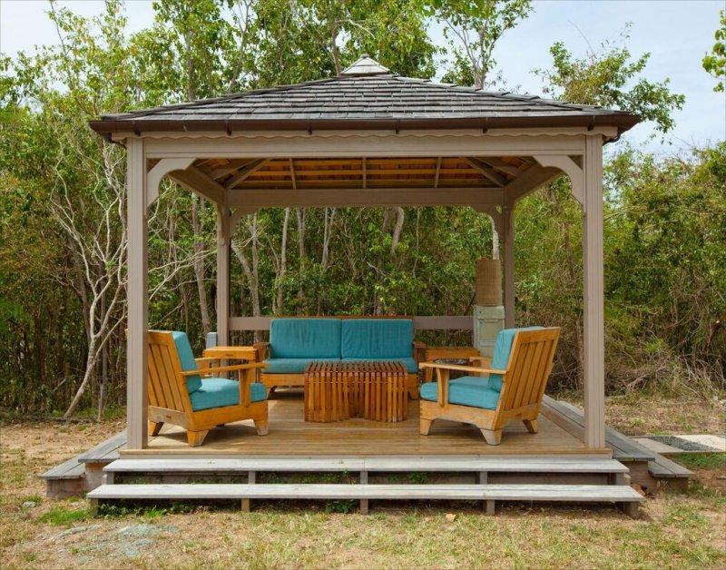 Выбор мебели. В деревянной беседке естественно будут смотреться стулья и стол, изготовленные из того же материала, особенно плетеные конструкции. В закрытых помещениях можно даже использовать предметы с обивкой.