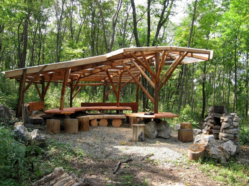 Лесной. На первый взгляд, строение имеет грубое оформление, украшается разными корягами, выстраивается вокруг старого дерева. Приветствуется резьба. Стулья могут быть сделаны из бревен и пней.