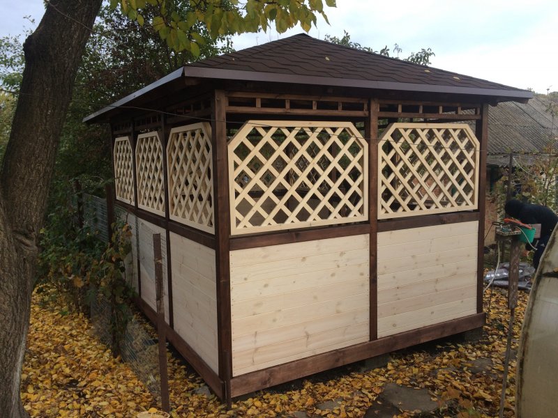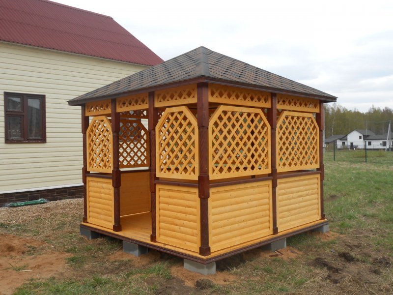 После того как каркас беседки будет собран и защищен от осадков надежной крышей, можно приступать к декоративной отделке. Для наружных стен используют следующие варианты: