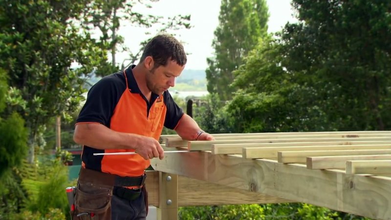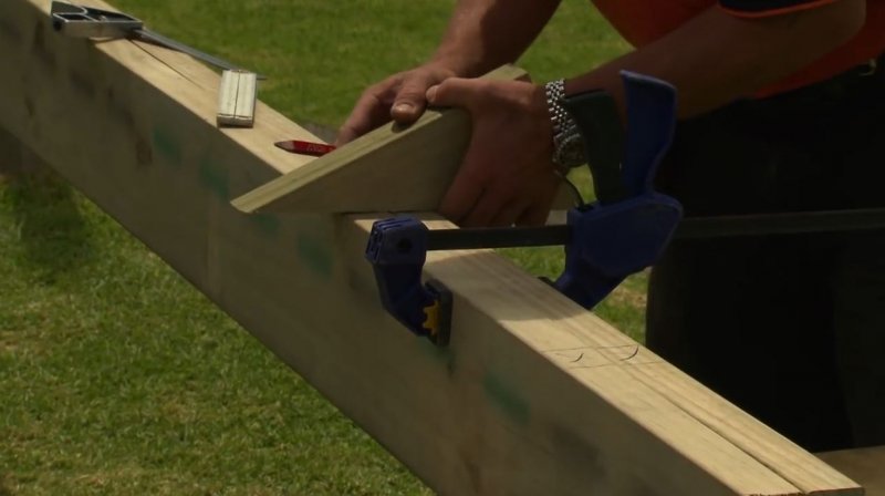 Стропильная система крепится к брусу верхней обвязки. Элементы состоят из реек, соединенных в виде треугольника при помощи металлических уголков. Стропы прибивают к верхнему брусу гвоздями и дополнительно фиксируют укосами. Если беседка будет большой, необходимо предусмотреть свес. Для этого в каждом элементе выпиливают посадочное место в виде треугольника. Чтобы правильно подогнать каждую ногу, следует воспользоваться подготовленным шаблоном.