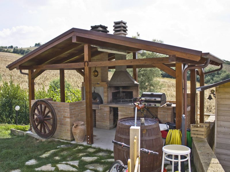 Средиземноморский стиль. Древесину для открытой беседки выбирают с мягким оттенком. Направлению соответствуют перголы с навесом, под которыми расположен кирпичный очаг.