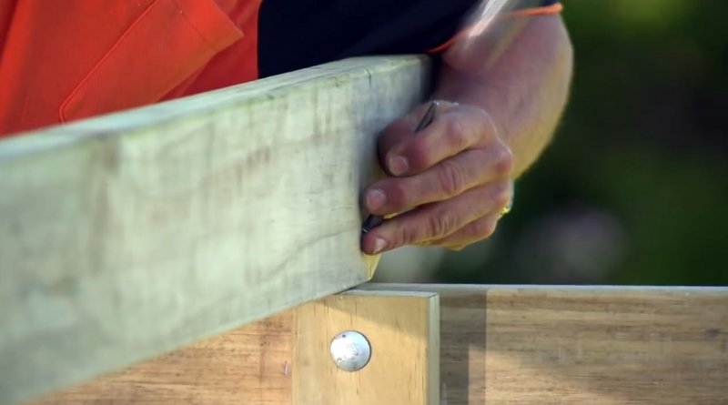 После сооружения фундамента, нижней конструкции балок и вертикальных стоек переходят к монтажу верхней обвязки. Это делают практически так же, как и с противоположной стороны, под полом. Тут одними гвоздями не обойтись, обязательно необходимо использование металлических уголков, особенно, если нижняя часть каркаса не укреплена укосами. В целях безопасности балки верхней обвязки надо накладывать на вертикальные стойки.