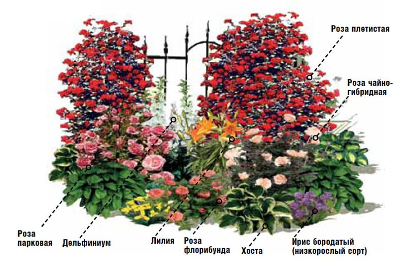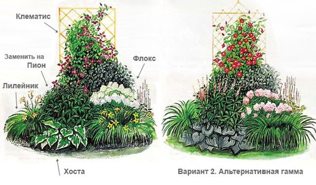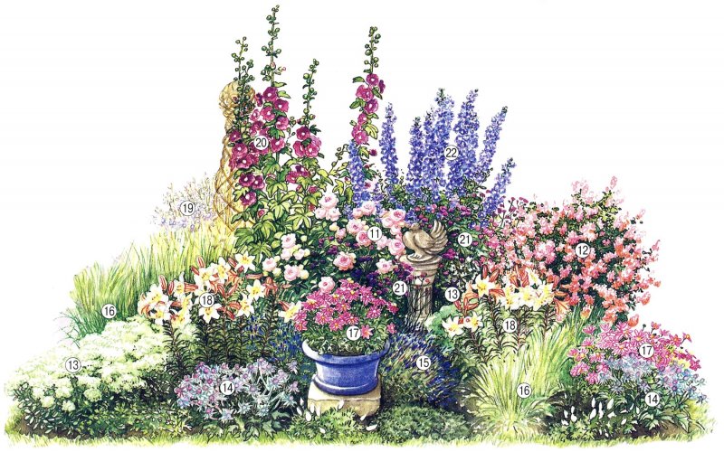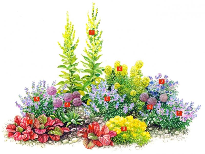 При создании композиции большое значение имеет высота стеблей и кустистость. Самые длинные многолетники помещают в центр или на задний план, если они не будут создавать тень остальным насаждениям. Для окантовки используют низкорослые цветочки (до 20 см). Посередине оставляют место для среднерослых.