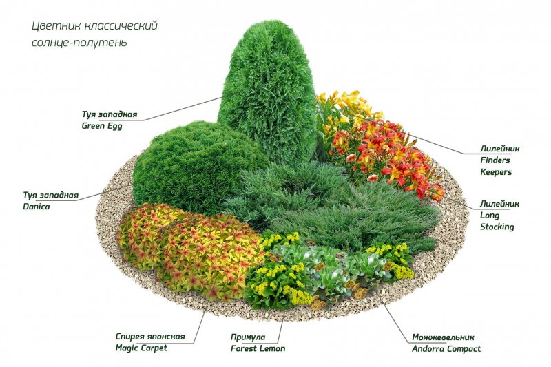 Центр также можно занять карликовыми деревьями, низкорослыми хвойными кустарниками. Их высота не должна превышать треть диаметра клумбы. Для одинаковых по высоте цветов подойдет клумба в форме пологой пирамиды. Луковичные растения, раннецветущие лучше сажать в центре, чтоб их увядающие цветы были спрятаны за зеленью многолетников.