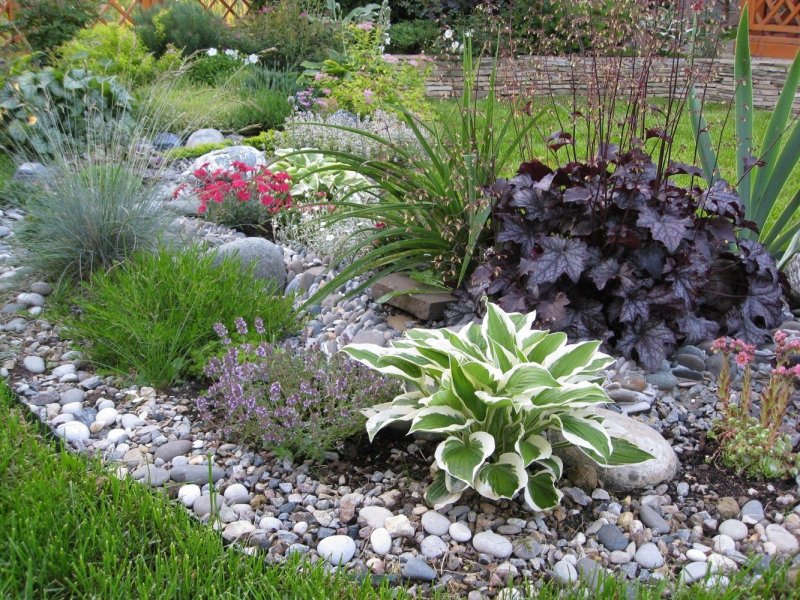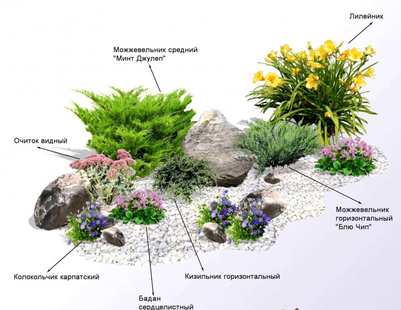 Рокарии. Растения в клумбе дополняет декор из камней, популярное название – каменные сады;