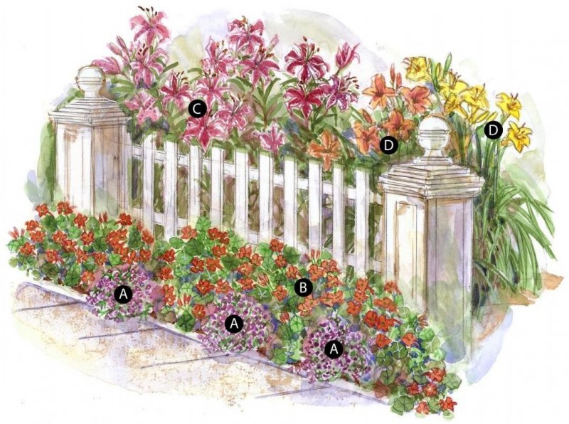 На заднем плане высаживают самые высокие шток-розы. Можно использовать один сорт или посадить одиночные растения нескольких цветов. Зацветут они в середине лета;