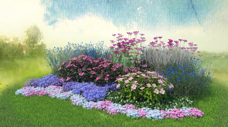 Яркую композицию удачно дополняет флокс «Дракон». Для него выделяют место в центре;
