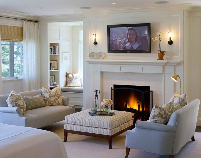 Камин можно отделать плиткой или другим материалом в тон стене. Интересным станет вариант дизайна квартиры с камином и телевизором.