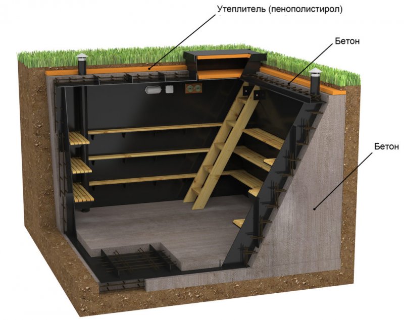 Перед началом кладки заливается фундамент, толщиной около 25 см. Первые ряды не обязательно изолировать. Кладка выполняться не до самого верха, а за 1 метр до края котлована. От качества выполнения перекрытия погреба зависит долговечность и надежность конструкции. Возьмите толстые трубы, диаметром 76 мм и обработайте и битумом. Кладите их не только на стены, но и так чтобы они держались на грунте. Для этого прокапываются траншеи. Расстояние меду матками зависит от выбранного материала перекрытия. Основанием для творила выступают матка и стены погреба. Творило должно выступать на 25 см над землей. Основная крышка моет быть сделана из любого материала, а зимняя желательно быть деревянной, предварительно обшитой синтетическим уплотнителем.