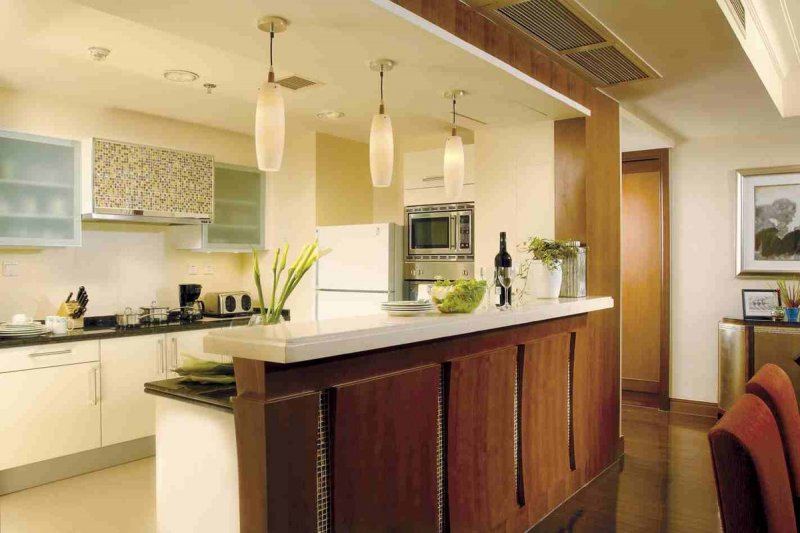 Кухня должна быть четко поделена на обеденную и рабочую зоны, а расстояние между ними нужно оставлять как минимум 120 см. Подбирать расположение кухонных полок под рост хозяина чрезвычайно важно, чтобы избежать проблем с позвоночником в будущем и банального дискомфорта с доставанием содержимого верхних полок.