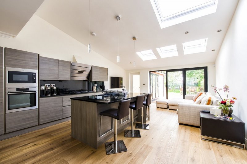 объединение кухни и гостиной – дополнительная экономия пространства в квартире, ведь современный ритм жизни предусматривает частое питание за пределами собственного дома и лишь небольшие перекусы на кухне.