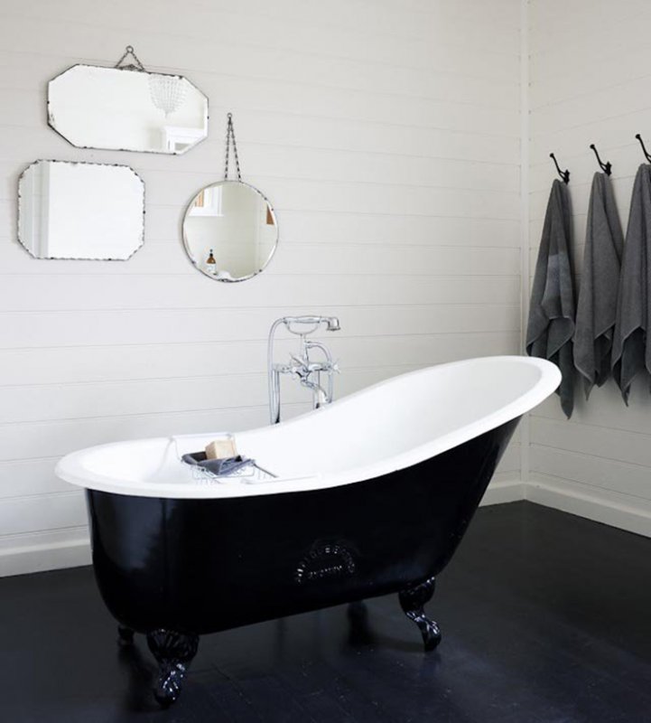 Черно-белая ванна — это не что иное, как белая ванна, даже чугунная, но в черном шкафу или в ретро-версии на левой ноге, окрашенной в черный цвет. Это не так впечатляет, как вся черная ванна, но это отличная идея для любителей современного и ретро-стиля, которые любят отдельно стоящие ванны.