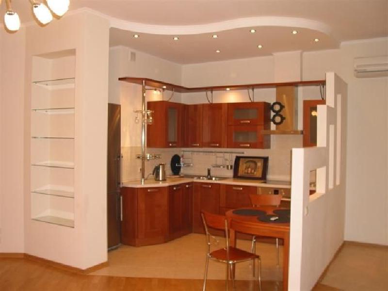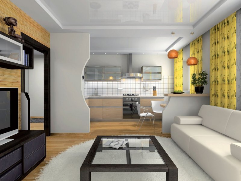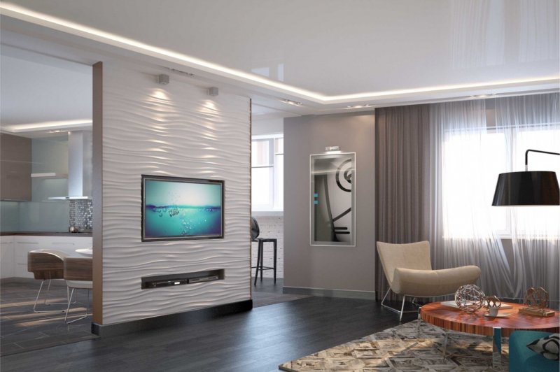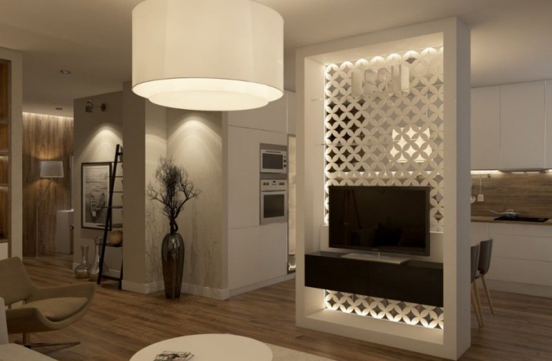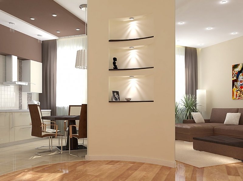 Наиболее простой способ оформления перегородки – сделать ее своими руками из гипсокартона. Детали из этого материала отлично формуются, отчего изделие может не только иметь фигурную форму. В нем будут расположены удобные ниши, полки, оно само становится барной стойкой. Сделать перегородку можно поручить специалистам, а установить самому.
