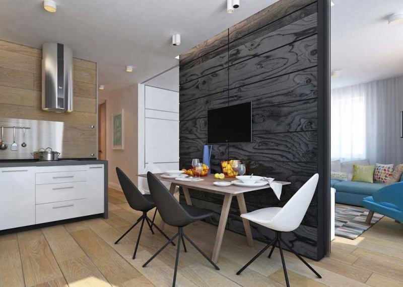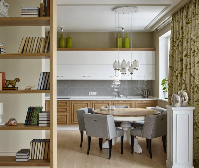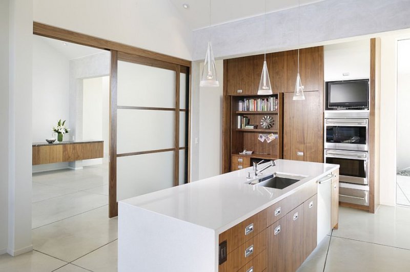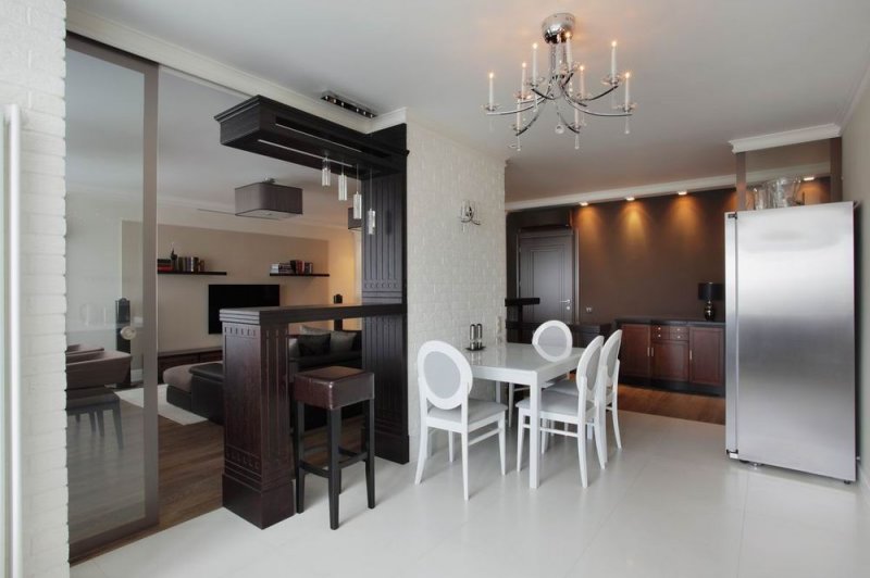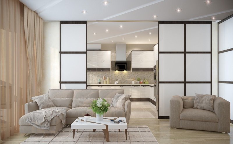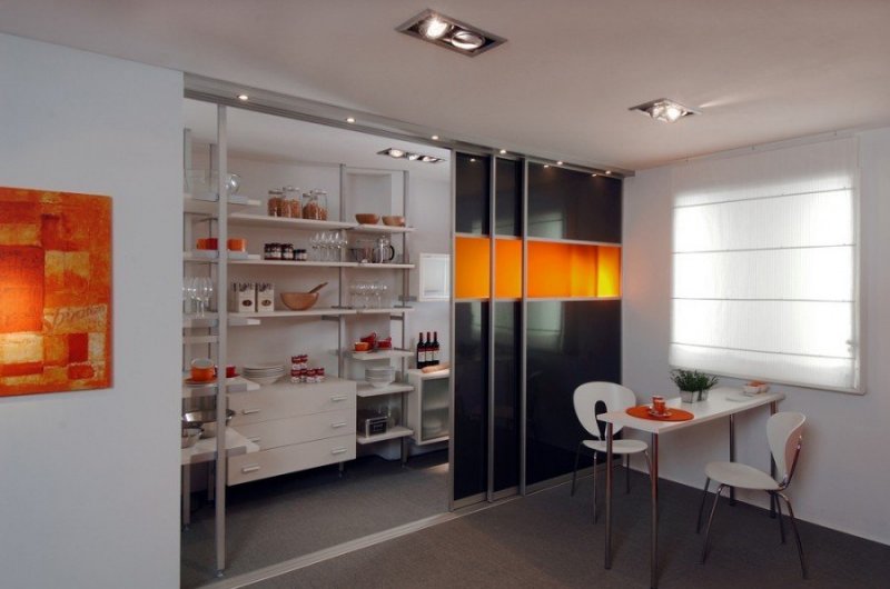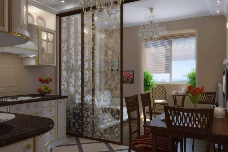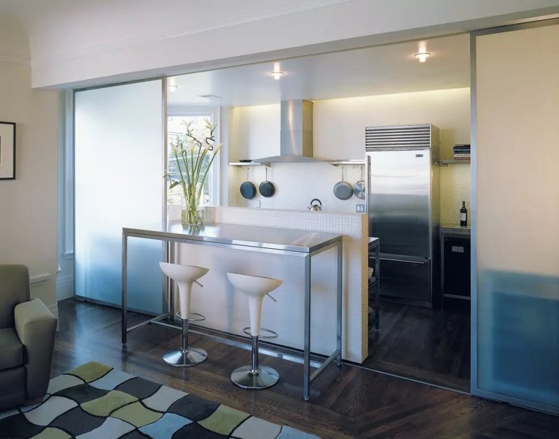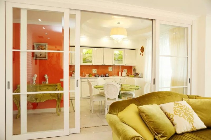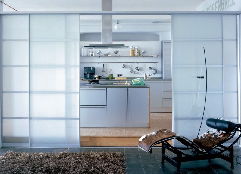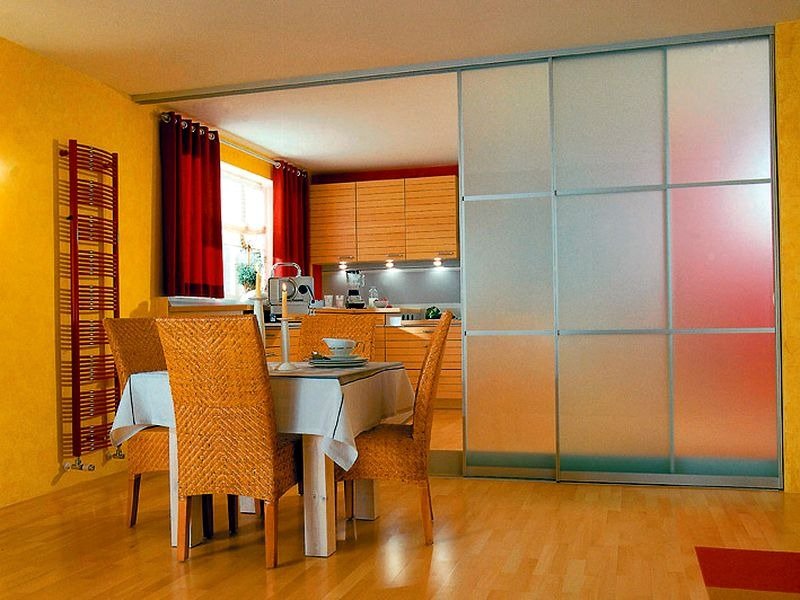 Данный тип более подходит для больших пространств. В просторной кухне можно соорудить одну из разновидностей конструкции: складную перегородку, раздвижную или дверную. Если необходимо, ее открывают и делают одну большую комнату. При приготовлении пищи перегородку закрывают, чем уберегают другие комнаты от проникновения туда запаха еды.