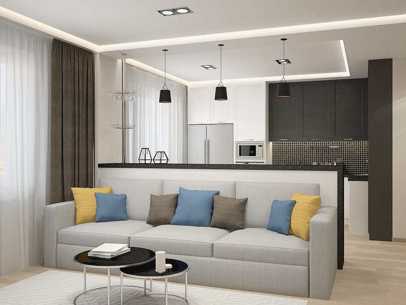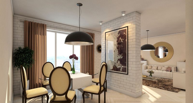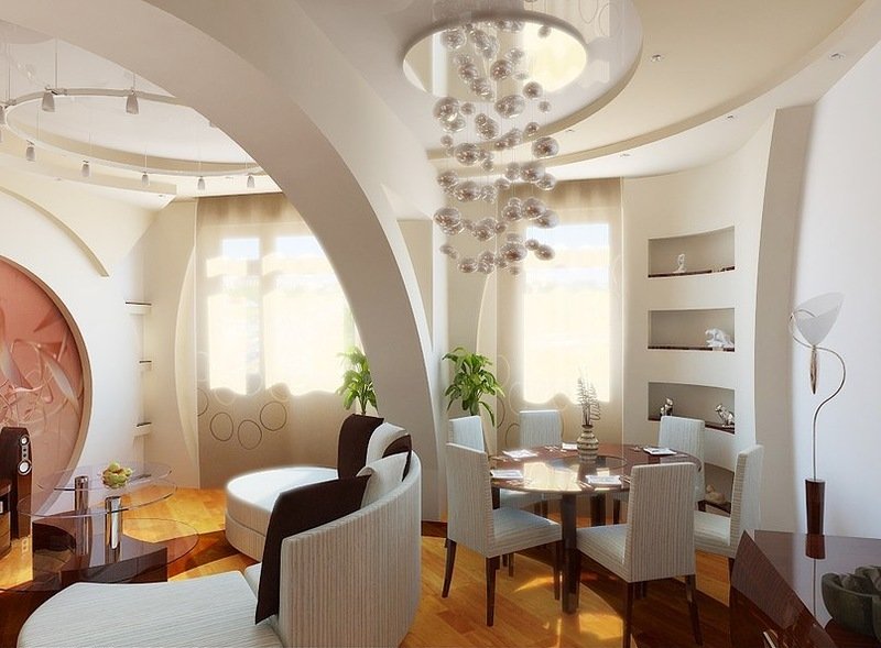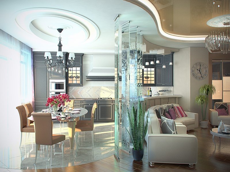 Классическим интерьерам сопутствуют светлые тона и декор в виде лепнины, молдингов. Для минимализма подбирают что-то попроще. В кухне-гостиной в лучших традициях лофта применяют штукатурку, которую декорируют кирпичной кладкой. Современный хай-тек подкрепит использование стекла и металла.
