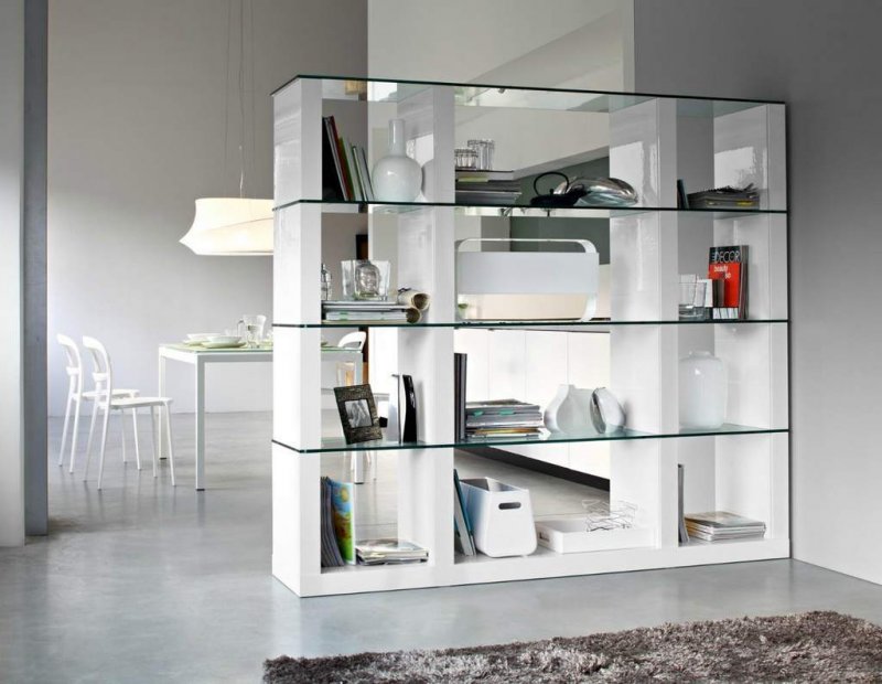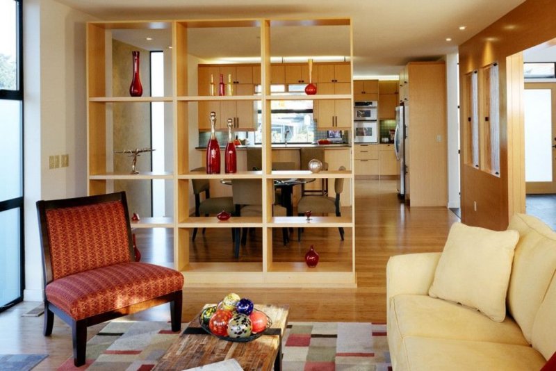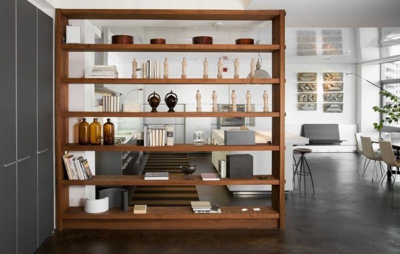 Отличие стеллажа от сплошной перегородки в том, что такая стена носит чисто символический характер. Он не скрывает происходящее за ним, позволяет обеим зонам хорошо проветриваться. Поскольку сквозные стеллажи не выглядят громоздко, они делают интерьер более воздушным и просторным.