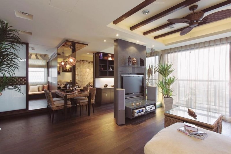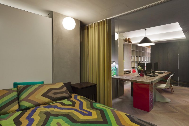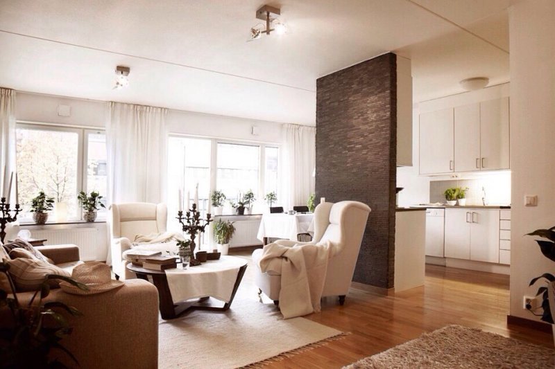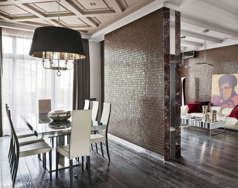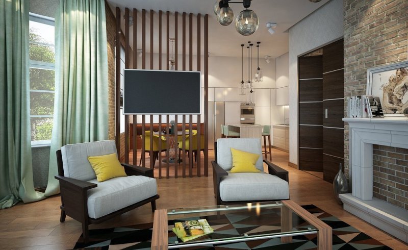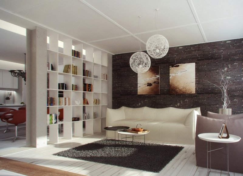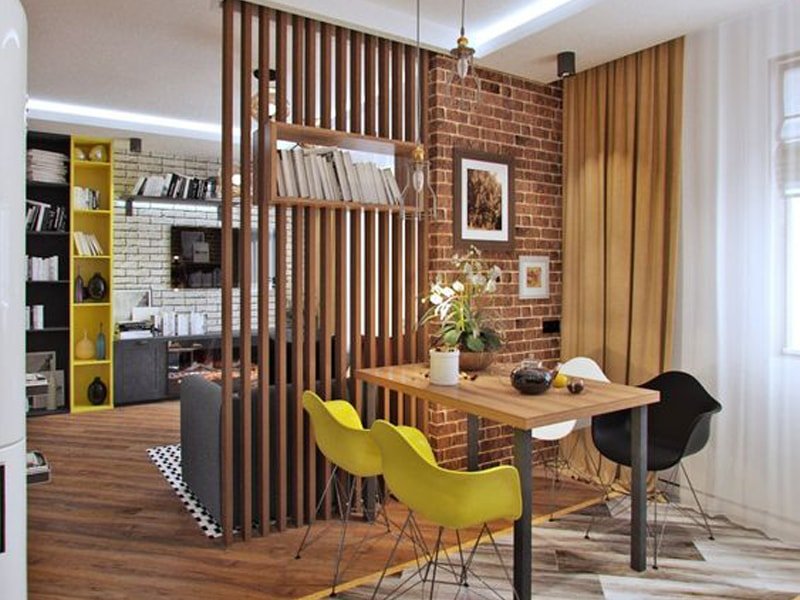 Нестандартно использовать в качестве разделителя стволы, ветки деревьев. Красивое решение проблемы – использование легкой ширмы. Их створки изготавливают из ажурных деревянных элементов, бумаги, шелка, парчи. Применяют бусы, бамбук, стекло, даже зеркала и нарезанные кольцами пластиковые трубы. Брутальная стильная деталь для интерьера лофт – перегородка из кирпичной кладки. Она задаст соответствующее настроение всему интерьеру.