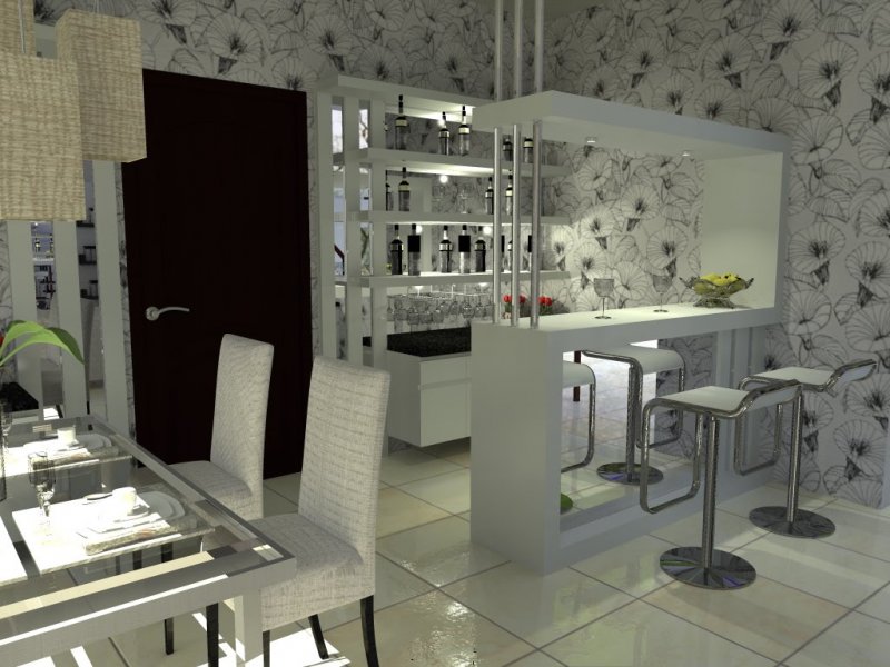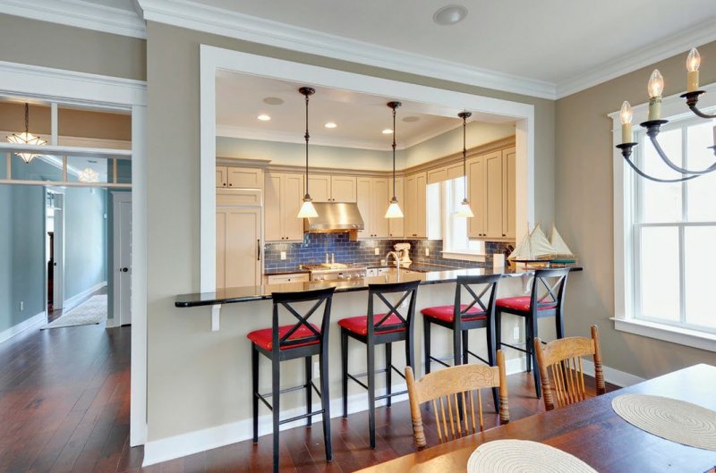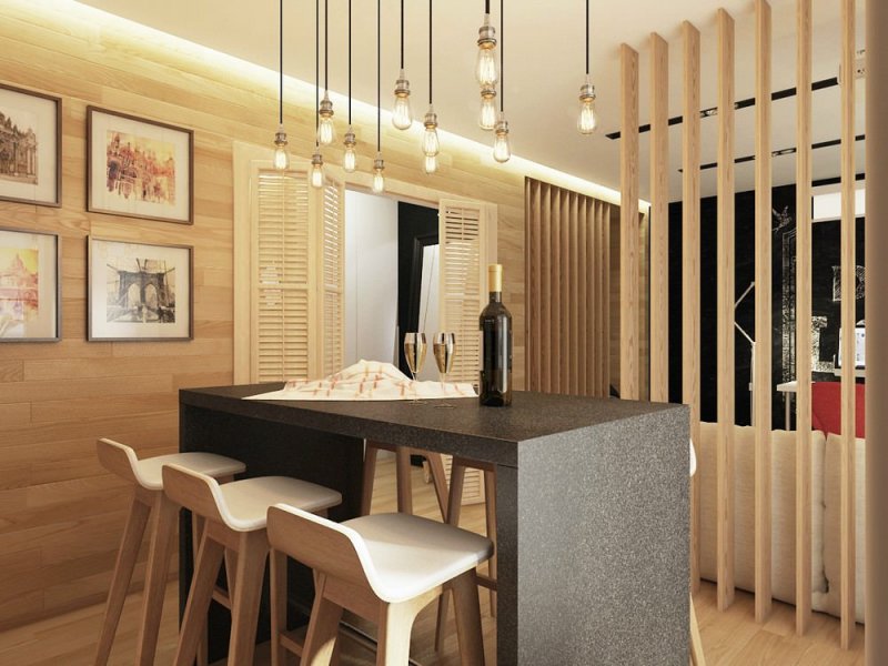Различные модели барных стоек имеют по нескольку уровней (что удобно при наличии малышей), дополняются шкафчиками и полками, оснащаются баром и подсветкой. Стойка гармонирует с остальными деталями интерьера или становится ярким его акцентом.