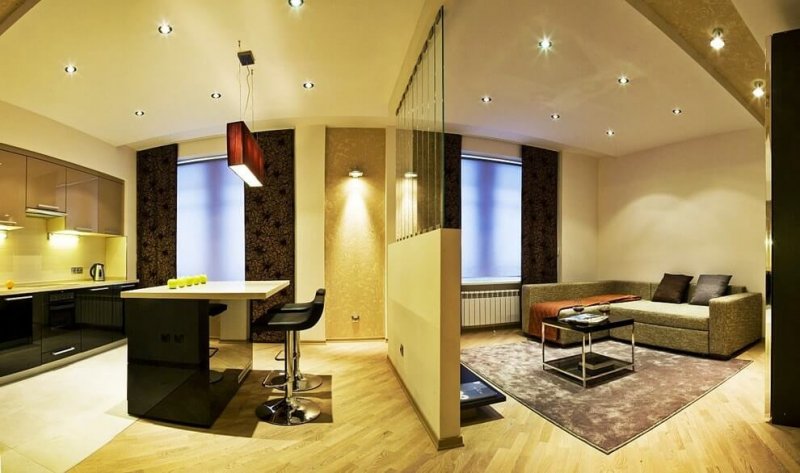 Освещение помогает выделить функциональные зоны. Сильнее подсвечивается рабочее пространство. Мягкое освещение планируют в зоне отдыха. Саму границу между кухней и сопредельным помещением освещают точечно, с чем хорошо справляется светодиодная подсветка. Она не должна противоречить дизайну помещения, а быть его дополнением.