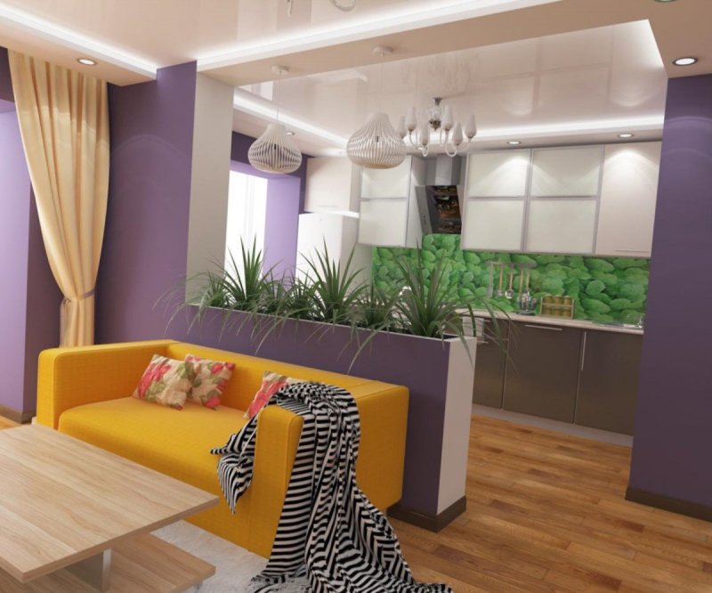 Эффектно смотрятся выстроенные в «стеночку» драцены, фикусы. Низкорослые растения располагают на подставках. Хорошо выглядит зеленая перегородка, произрастающая из длинного напольного ящика. Для зонирования ампельными или вьющимися растениями к потолку крепят специальную полку, где расставляют горшки с пилеей, зебриной, эсхинантусом или пеллионией. Зеленой перегородкой становятся комнатные лианы. Для их побегов выстраивают специальные деревянные или из проволоки опоры между потолком и полом.