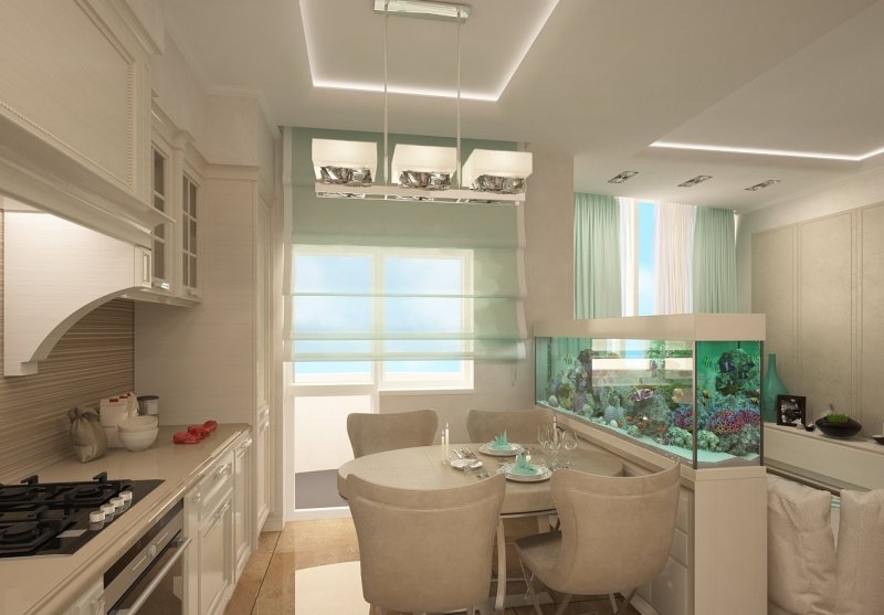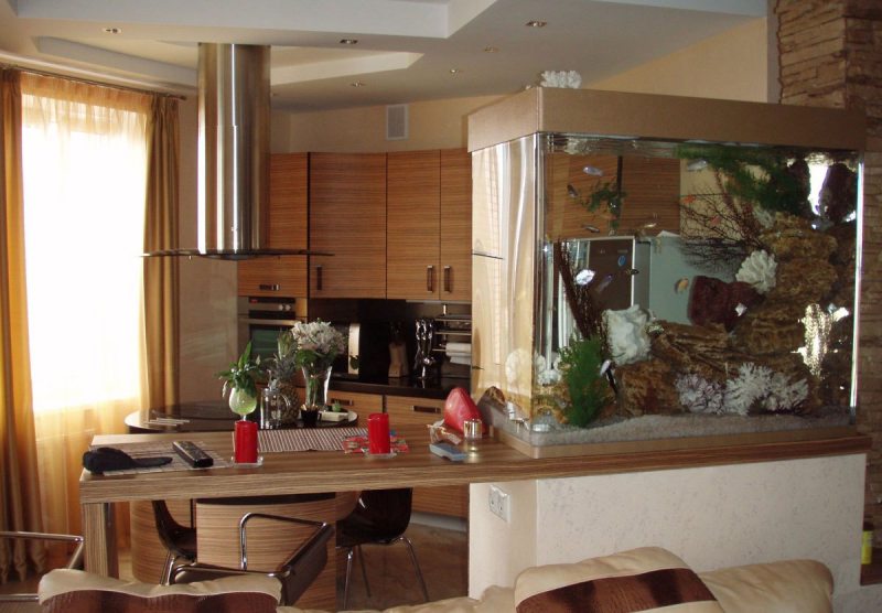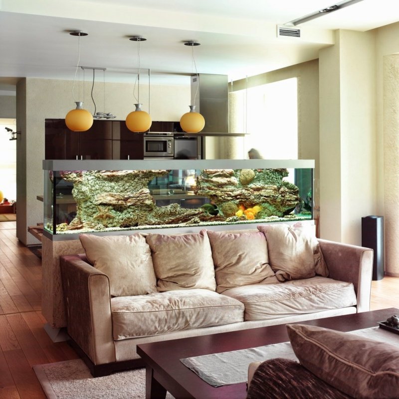 Использовать декоративные растения или аквариум в качестве перегородки – оригинальная идея. Если продумать форму, размер аквариума, он не займет дополнительного места. Кроме того, под ним можно разместить дополнительный шкафчик для хранения, а передвижением обитателей любоваться в часы досуга. Аквариум решает проблему плохой освещенности. Он не создает барьера для естественного света, сам является дополнительным его источником.